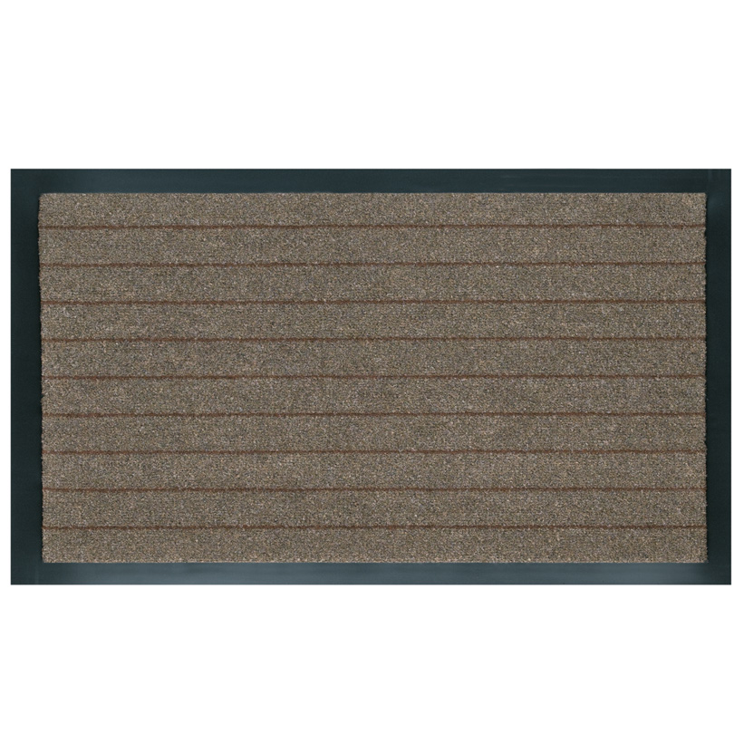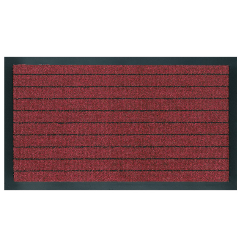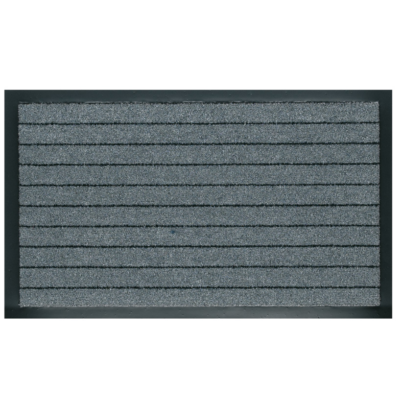 Fabricado con polipropileno y con la base de vinilo. La parte superior del felpudo es de polipropileno acolchado y con relieve creando un efecto de rallas. Diseño del felpudo en rectangular.