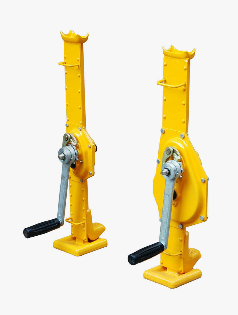 Gatos de columna con pie fijo para cargas de hasta 20 toneladas. La carga se mantiene en su posición estable a cualquier altura en caso de que no se accione la manivela.