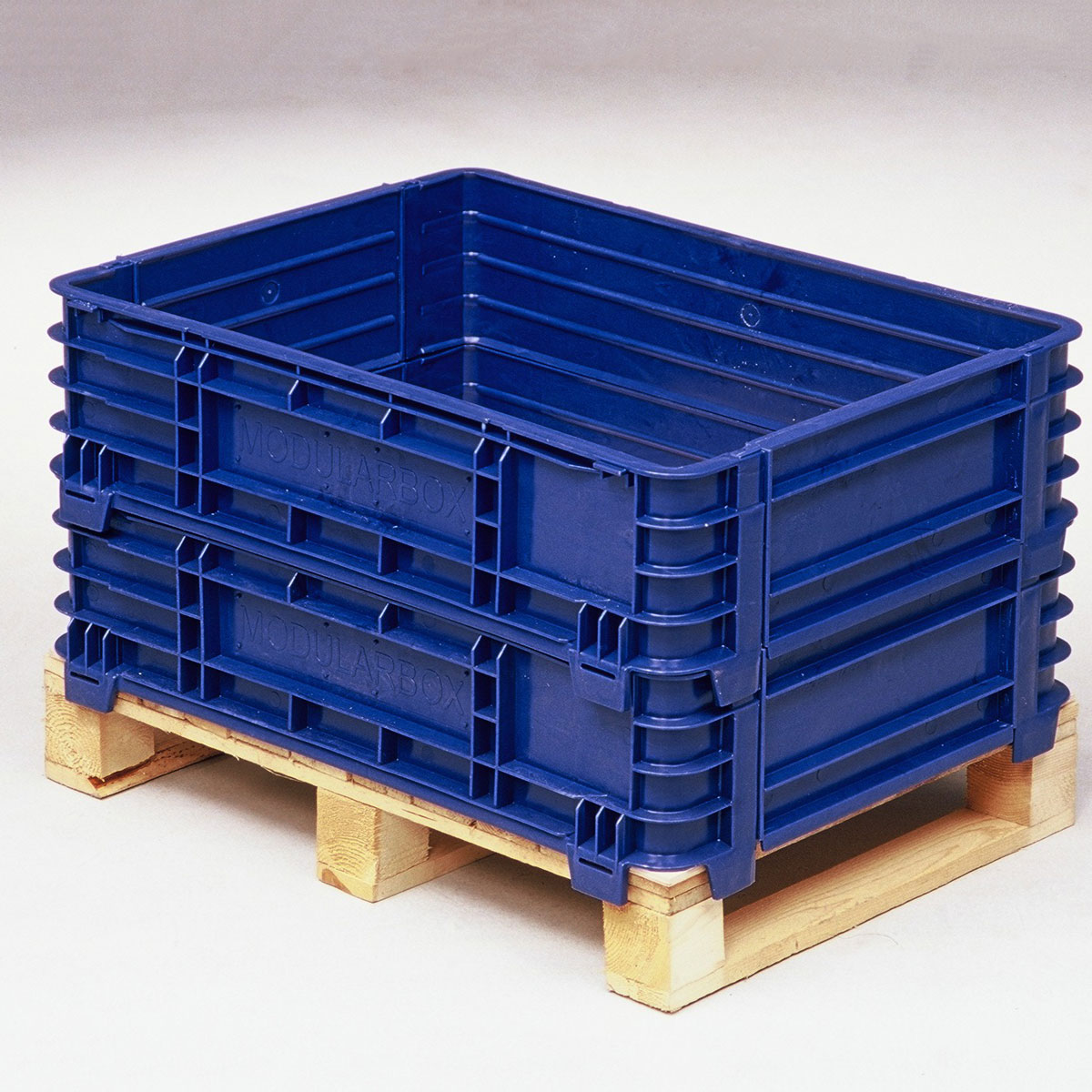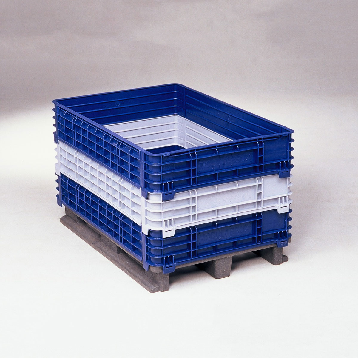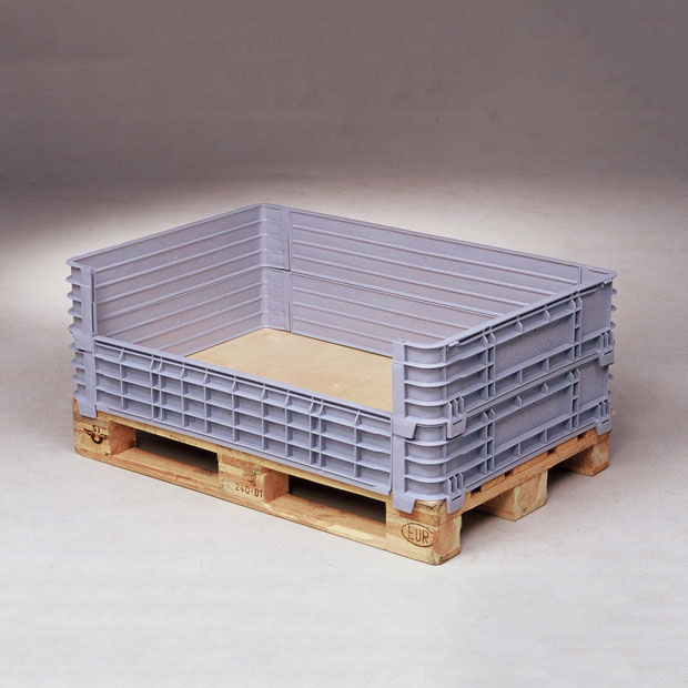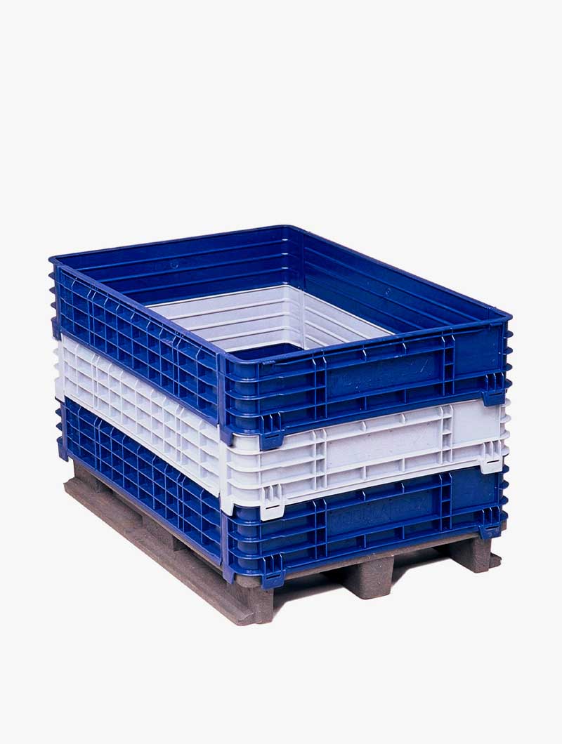 Grandes contenedores plásticos con collarines desmontables. para dar una mayor versatilidad y un mínimo volumen en almacenaje.