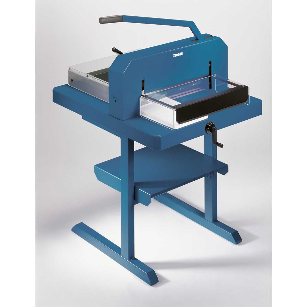 Mesas metálicas macizas que sirven de base firme para cortar. Robusto mango para realizar los cortes sin esfuerzo. Cuchillas atornilladas y afilables, con protectores metálicos de seguridad. Prensado rápido y confortable. Topes angulares y posteriores con escalas milimétricas. Capacidad de corte en A4 – 70 gr. De 300 a 800 hojas. Consulte las opciones.
