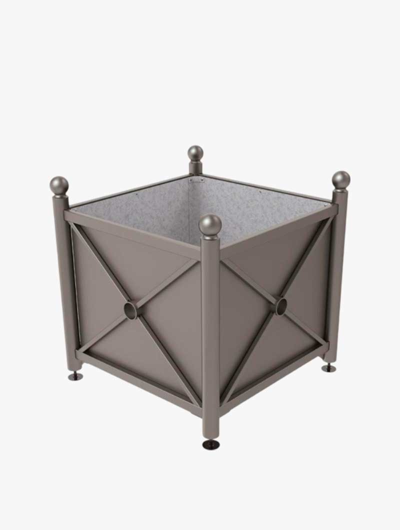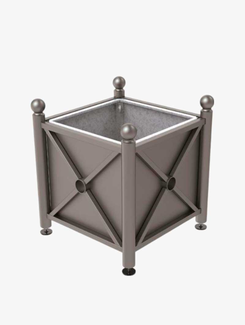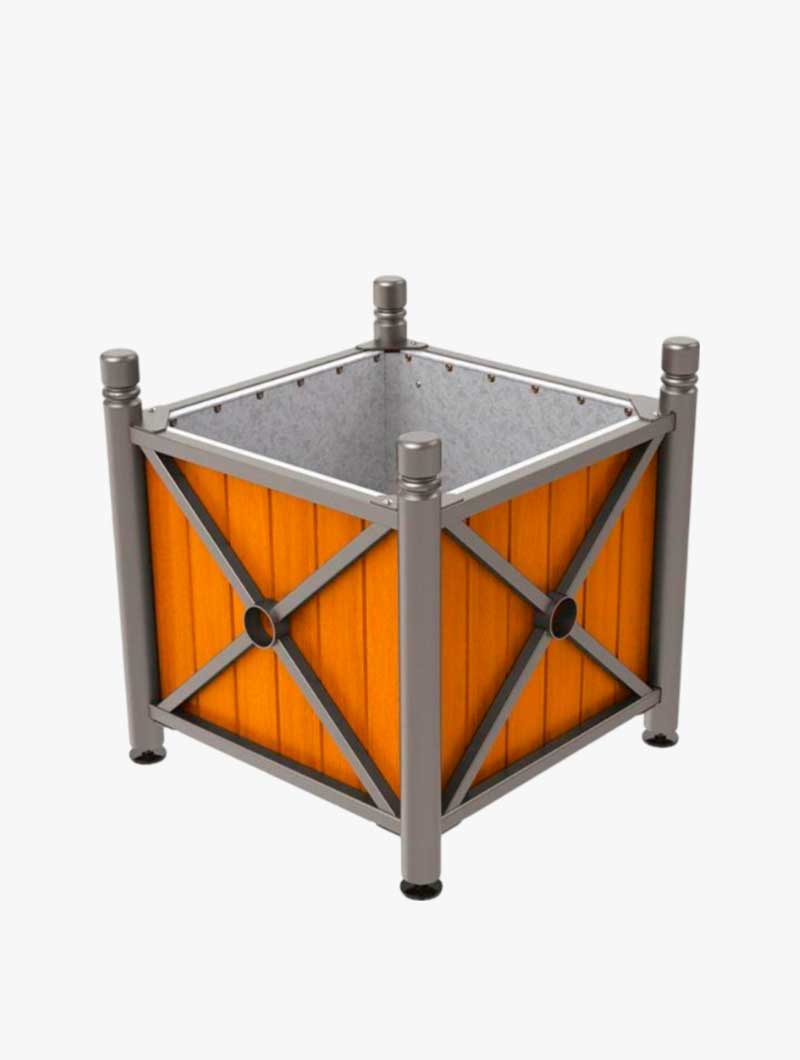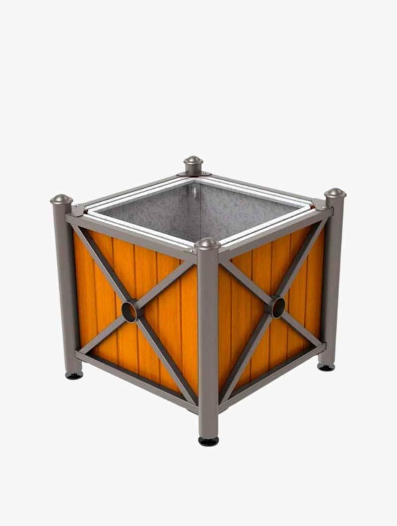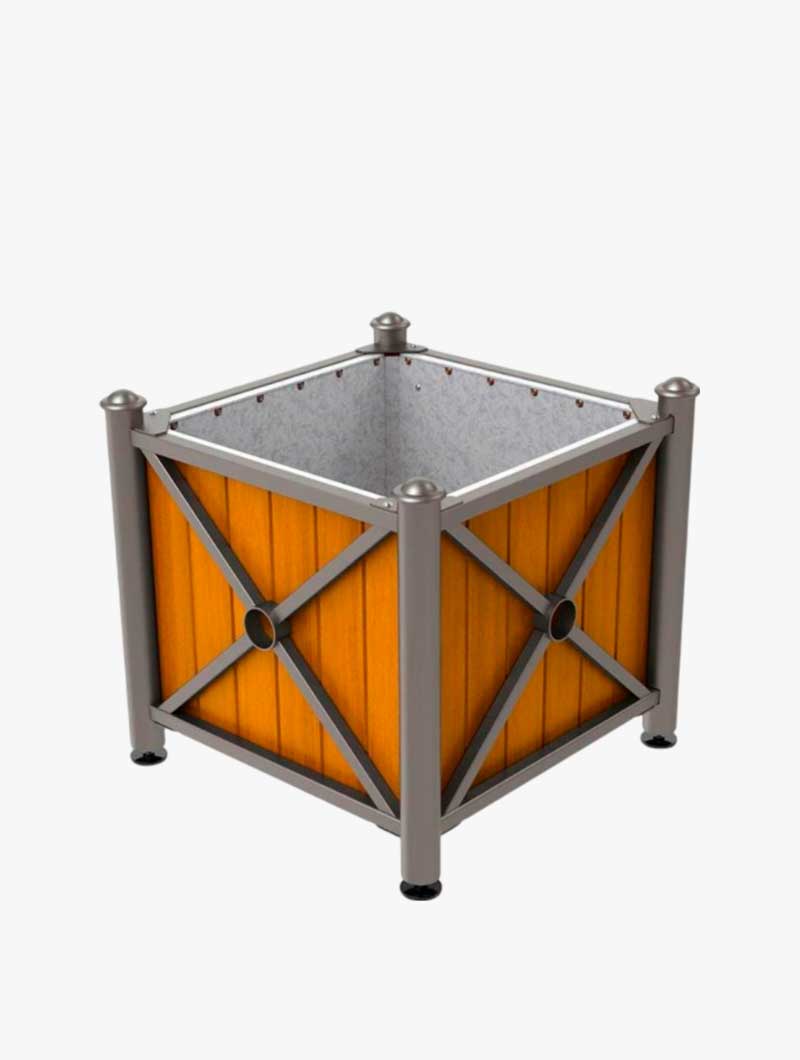 Jardinera Lirio para exterior con un diseño clásico con la posibilidad de personalizar el conjunto eligiendo un cabezal decorativo. Disponible en una combinación de acero y madera, o bien totalmente fabricado en acero. Asimismo, también esta la opción de seleccionar entre tres diseños distintos de cabezales o prescindir de ellos según su preferencia. Disponible en con dos interiores distintos: uno con revestimiento de chapa de acero galvanizado y otro con cubo interior extraible en acero con asas de manutención.