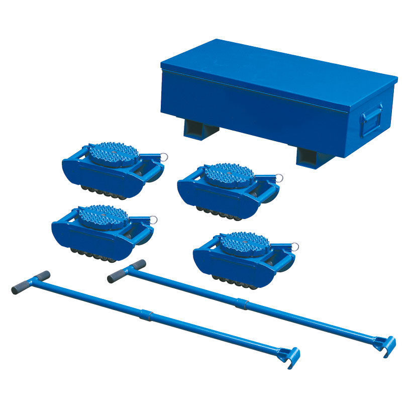 Este kit incluye 4 patines de carga deslizantes equipados con un plato giratorio que puede ser de goma o acero, permitiendo al usuario elegir la opción que mejor se adapte a la carga (para evitar deslizamientos) y a las condiciones del suelo (para protegerlo). El kit completo incluye los tiradores necesarios para el control de la maniobra, y se organiza en una robusta caja metálica, facilitando su transporte, almacenamiento y conservación.