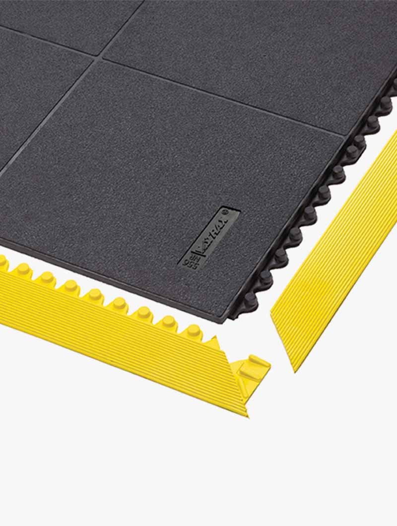 Se pueden limpiar con chorro de agua a presión (caliente) y pueden acceder vehículos con ruedas (ej. carros). Beneficio ergonómico derivado de una plataforma de trabajo de 19 mm de espesor con una superficie cerrada de estructura de guijarros antideslizante. Patentado para soluciones de biselado de seguridad inteligente; permite esquinas exteriores e interiores. La suciedad se puede eliminar fácilmente ya que la loseta se puede enrollar y el suelo queda libre para facilitar la limpieza. Rampas disponibles para garantizar una buena transición con el nivel del suelo.