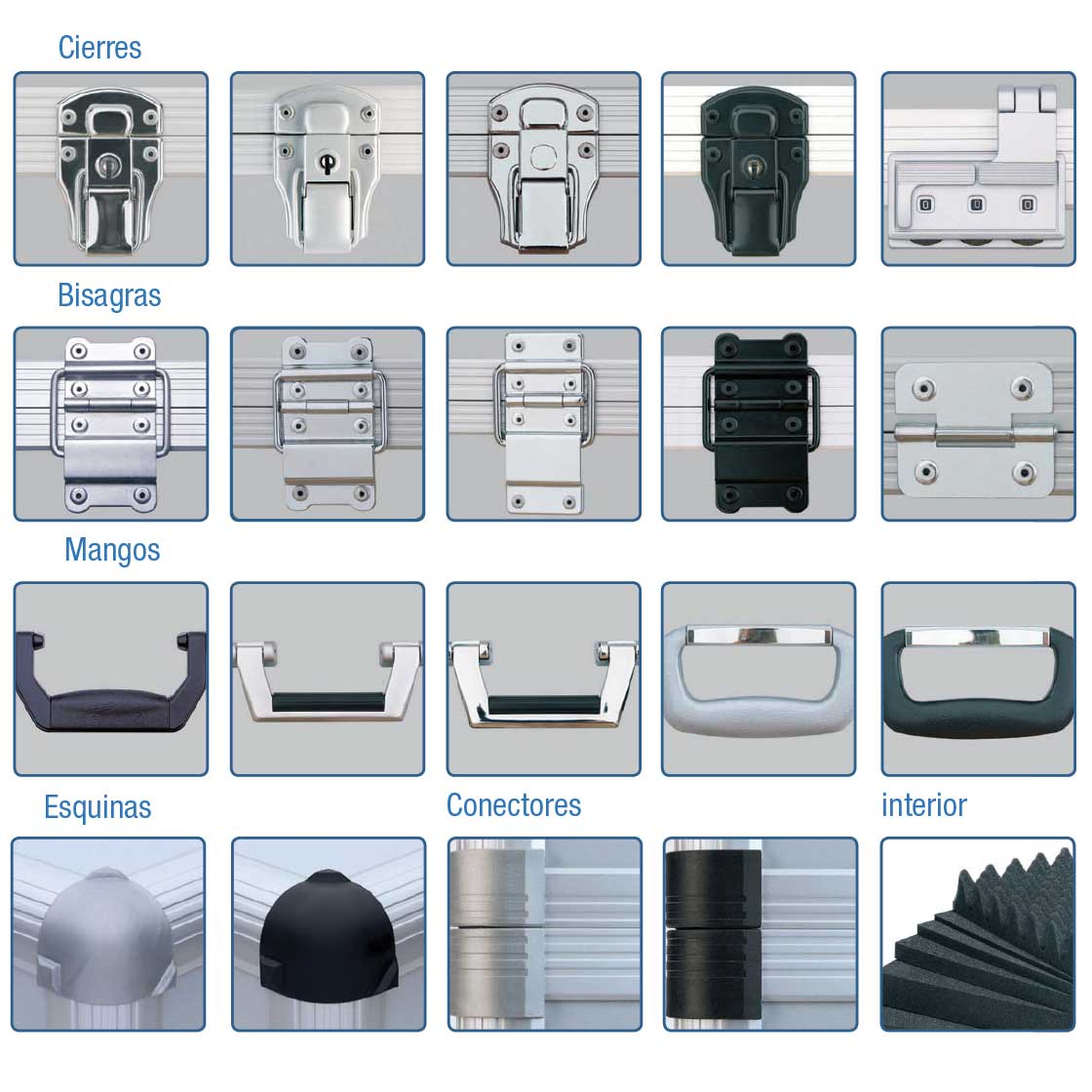 Maleta con marco y superficie de aluminio anodizado. Asa ergonómica de transporte. Bisagras flotantes de plástico con pata integrada.