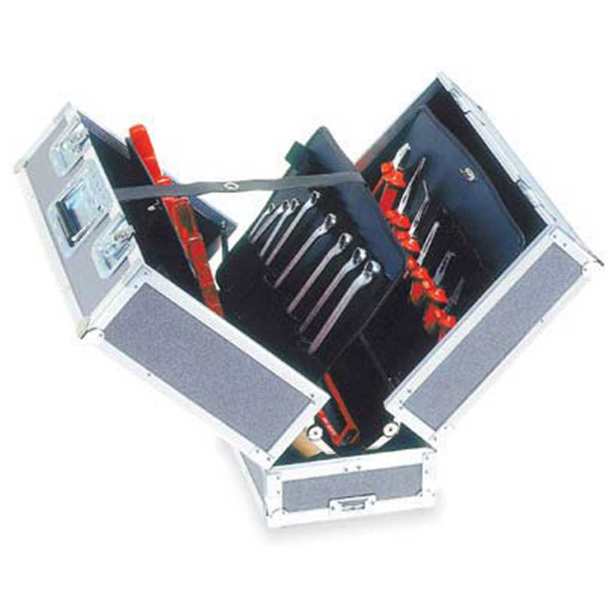 Maleta de transporte aérero para herramientas, con apertura en sistema de “V” con ángulo de apertura máxima de 95º. Todas las herramientas son accesibles en el momento de la apertura. Se transporta en la misma posición que se realiza el uso de la misma. Consta de 4 paneles dobles porta-herramientas, desmontable y reemplazable mediante fijación de tornillo rápido. Asas y tirador integrados y escamoteables para evitar riesgos de transporte.