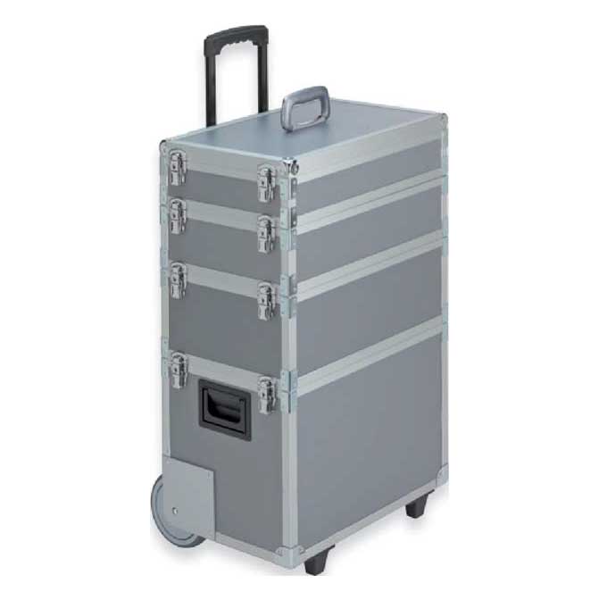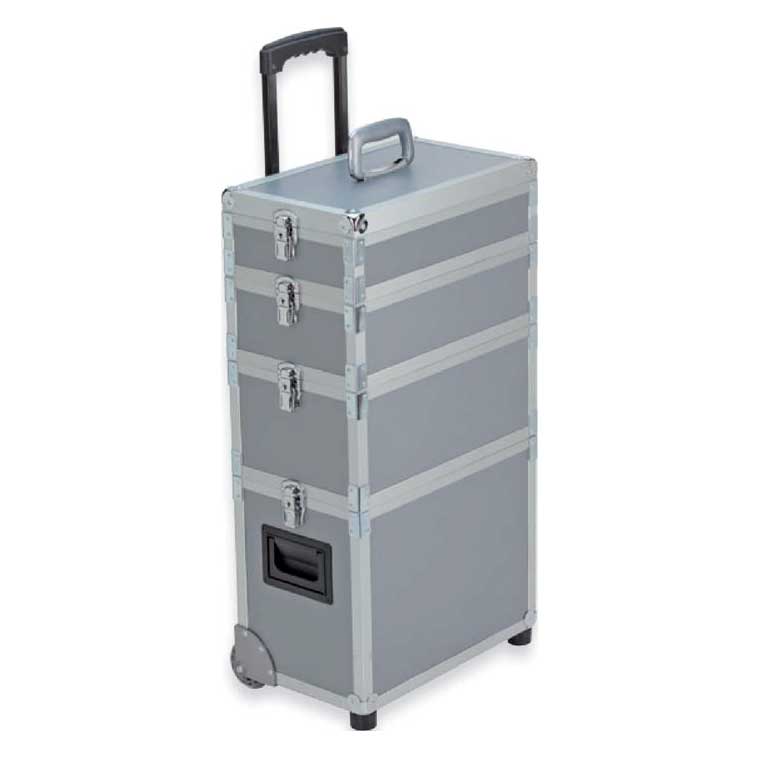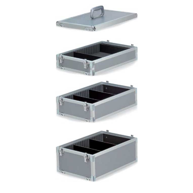 Maleta de aluminio de alta precisión con diferentes módulos combinables para tener una máxima versatilidad. Perfiles de aluminio extruído y anodizado. Superficie laminada en color gris plata. Diferentes modelos disponibles de asa ergonómica y tirador retráctil integrado. Ruedas de Ø 150 mm. con recubimiento de goma y patines de protección. Esquinas reforzada con protectores de acero cromado. Módulos apilable entre ellos sin necesidad de seguir un orden. Diferentes modelos de cerradura disponibles como opción. (con llave, de combinación, con cerradura ciega) y de bisagras (de piano, flotante, cromada, negra...). Los colores de la cerradura y la bisagra se pueden combinar en cromado, gris plata y negro. Separadores interiores de diferentes alturas para optimizar el espacio. La tapa se integra en cualquiera de los módulos.