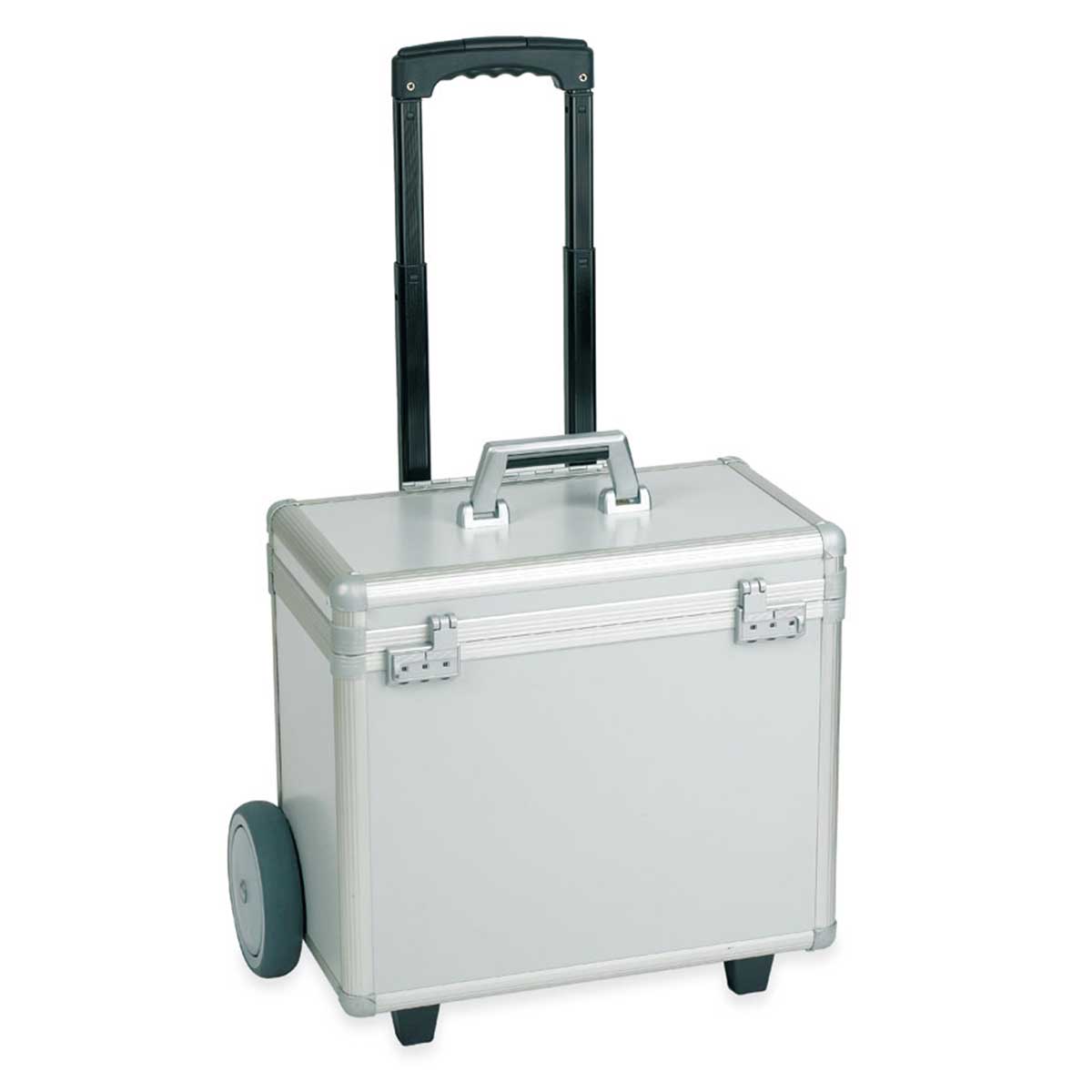 Esta maleta trolley para presentaciones cuenta con un marco de aluminio anodizado, lo que le aporta rigidez estructural sin aumentar el peso. La superficie laminada en color gris plata ofrece un acabado limpio y profesional, resistente al uso diario y fácil de limpiar.