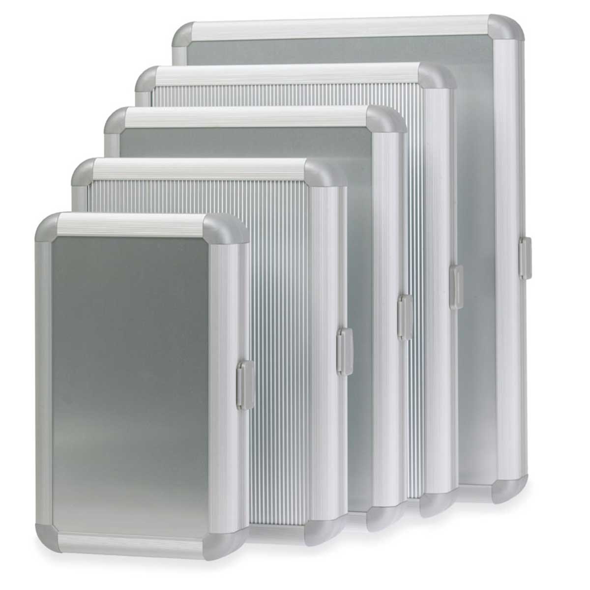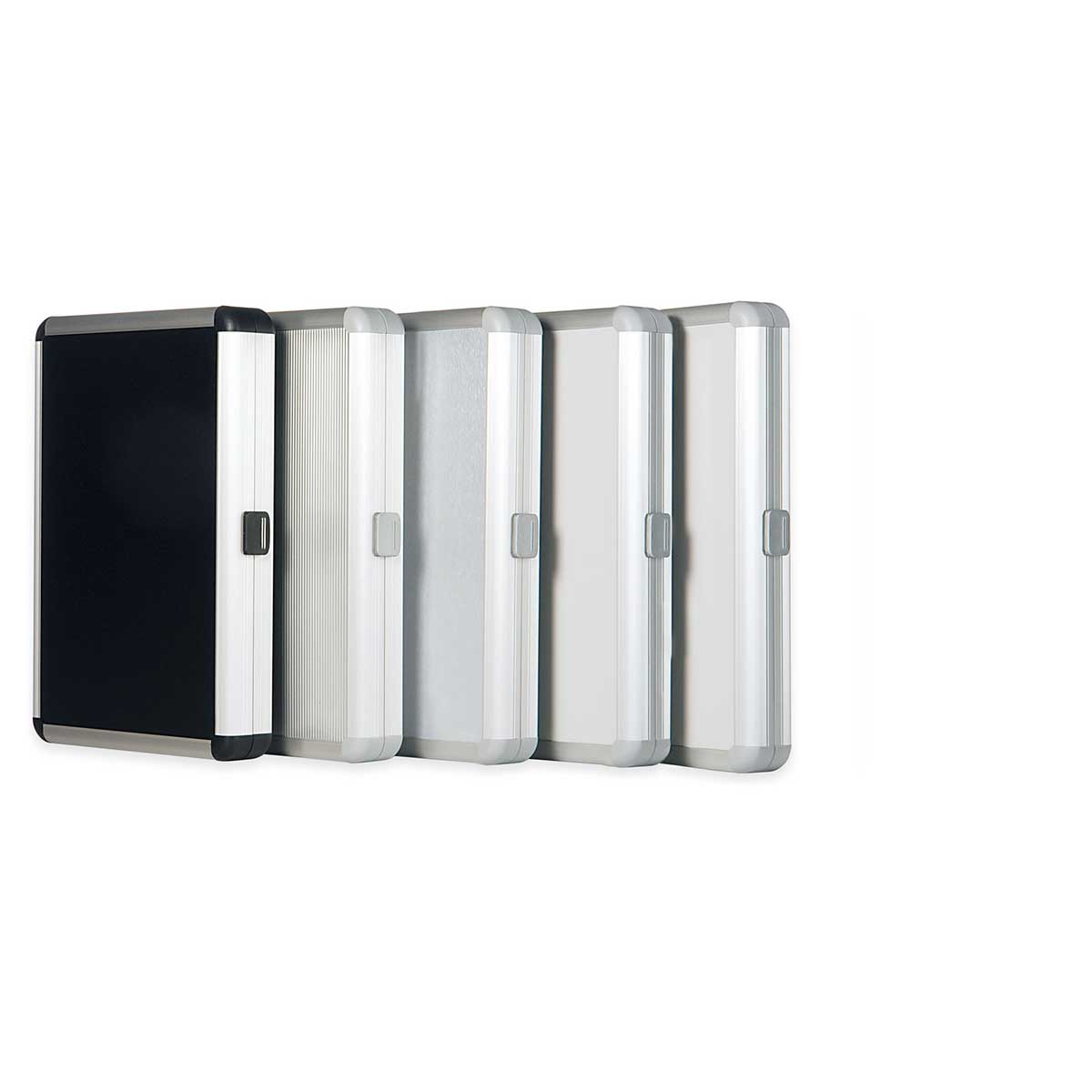 Maleta con marco de aluminio y esquinas plásticas redondeadas. Diferentes tipos de superficie disponible (ver tabla inferior). Bisagras plásticas en color negro o gris. Posibilidad de inlcuir logotipos o tipografías en los paneles.