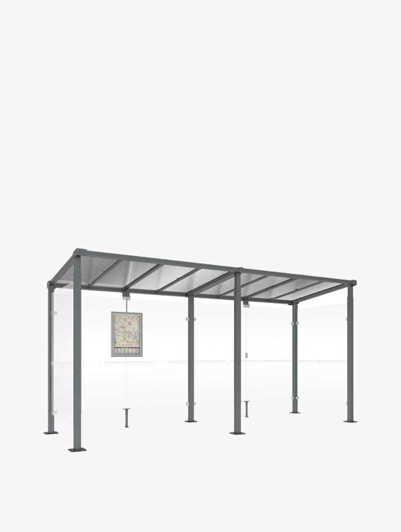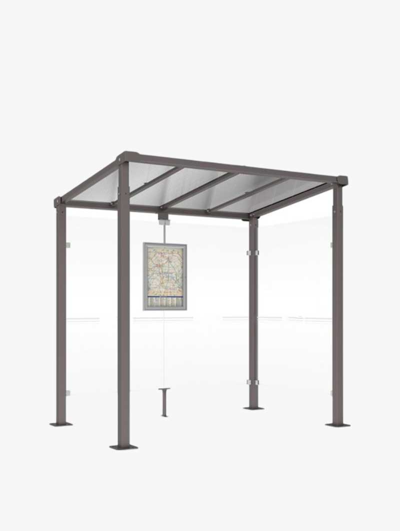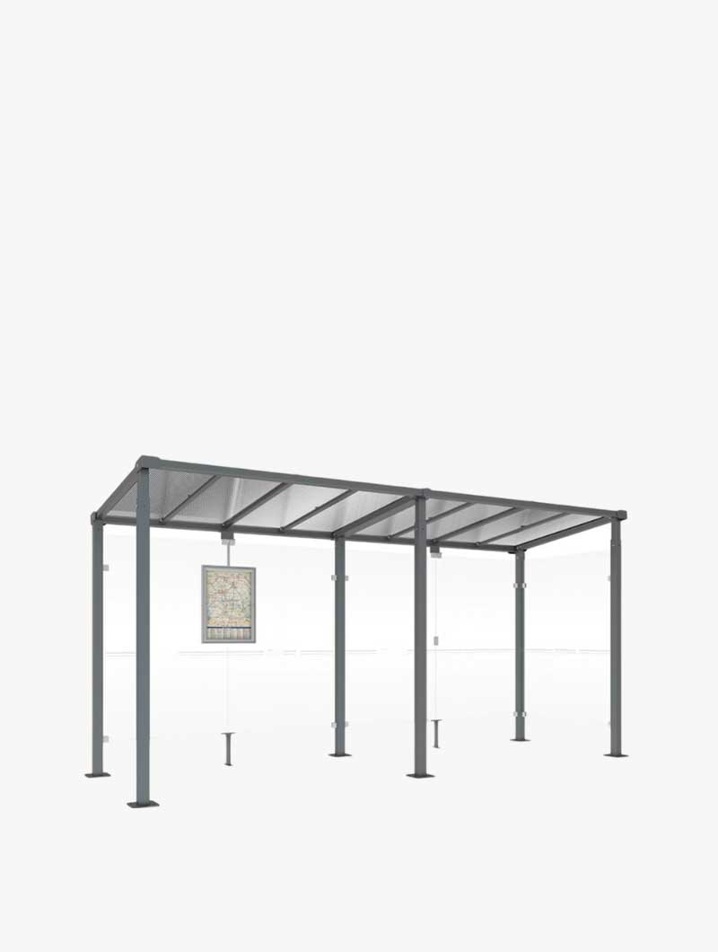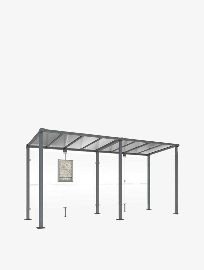 Marquesina Hibisco con postes cuadrados de tubo de acero 80 x 80 mm sobre placas. Techo con paneles de policarbonato alveolar de 10 mm con tratamiento anti-UV. La estructura del techo es de acero galvanizado de 60 x 60 mm. Acabado con pintura sobre galvanizado según nuestra gama de colores.