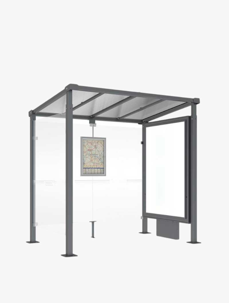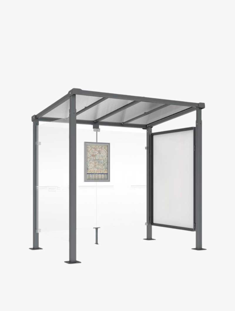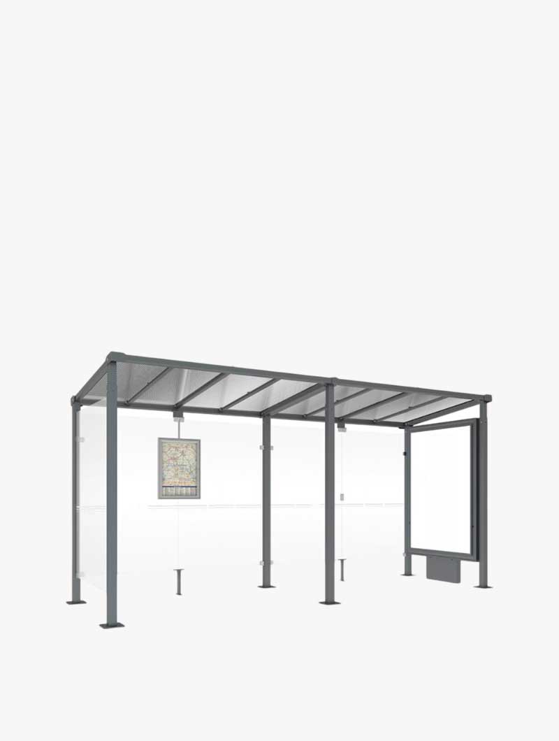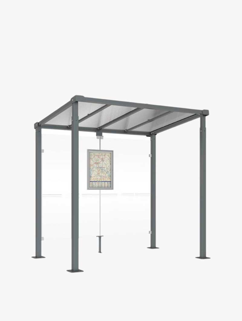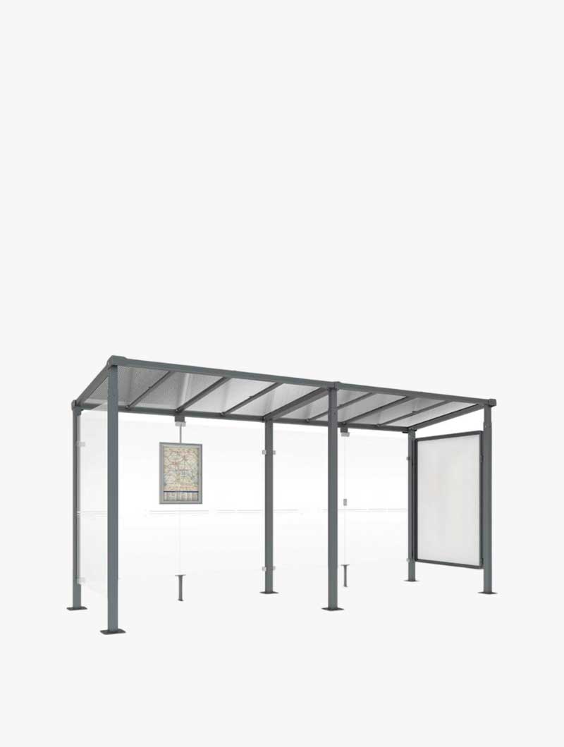 Marquesina Hibisco con postes cuadrados de tubo de acero 80 x 80 mm sobre placas. Techo con paneles de policarbonato alveolar de 10 mm con tratamiento anti-UV. La estructura del techo es de acero galvanizado de 60 x 60 mm. Acabado con pintura sobre galvanizado según nuestra gama de colores.