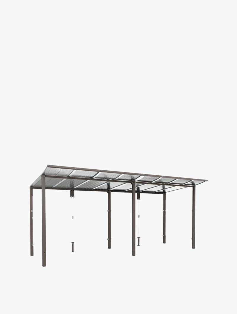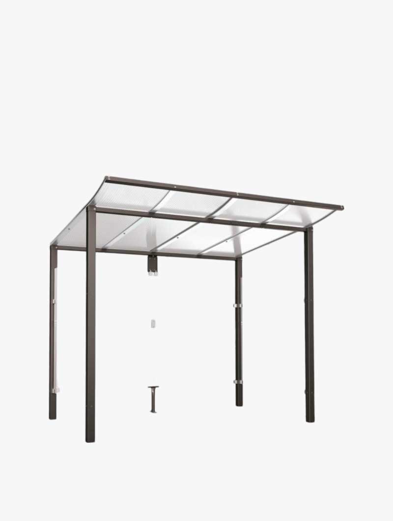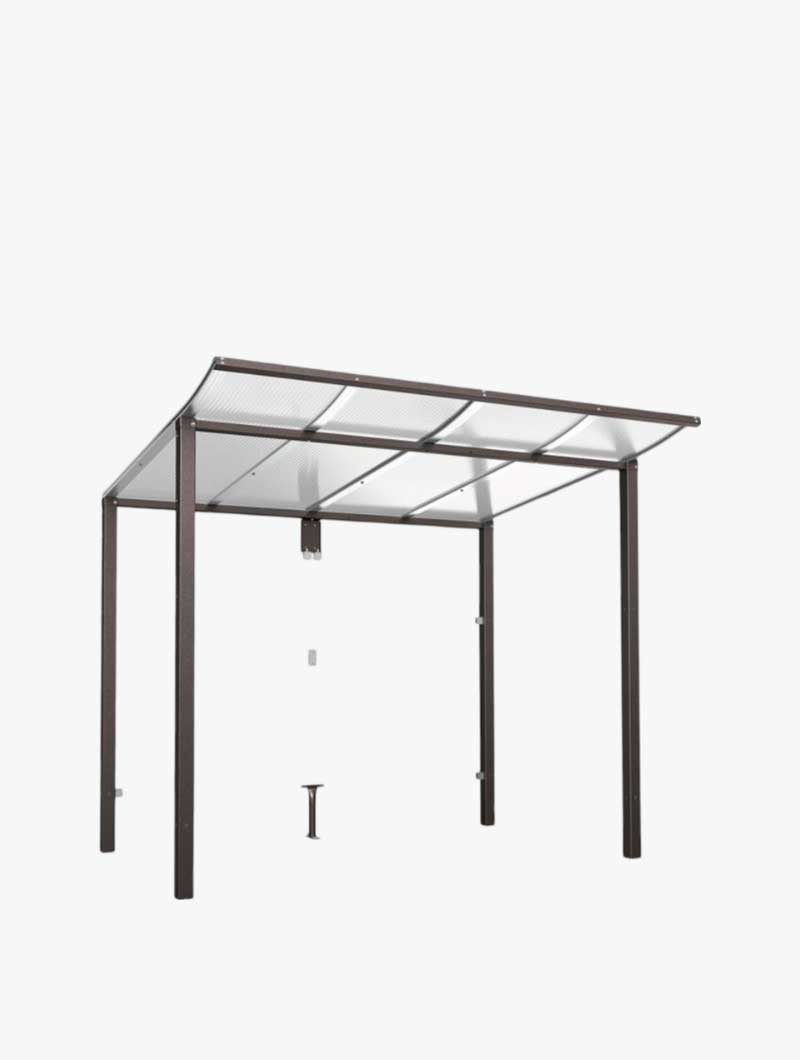 - Techo de perfiles en aluminio adonizado, travesaños de tubo de acero 40 x 40 mm y paneles de policarbonato alveolar, de 10 mm de espesor con tratamiento anti-UV.