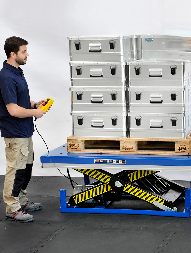 El manejo de la Mesa elevadora eléctrica de tijera simple se realiza mediante una caja de pulsadores conectada al cuadro eléctrico, con función “operario presente” y pulsador de emergencia “STOP” con enclavamiento. Se entrega completamente montada, lista para su conexión, e incluye toda la documentación técnica y declaración de conformidad CE.