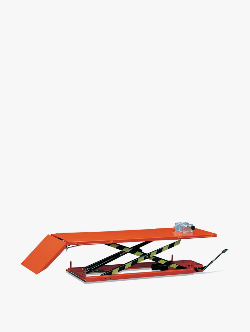 Esta mesa elevadora manual para motocicletas para 500kg incorpora un sistema de sujeción de ruedas y una rampa de acceso integrada en la plataforma, junto con una trampilla deslizante de 625 x 310 mm que facilita el acceso a la rueda trasera sin necesidad de desmontar el vehículo. El control del ascenso y descenso se realiza mediante pedales independientes que actúan directamente sobre las válvulas hidráulicas, ofreciendo un manejo preciso y seguro.