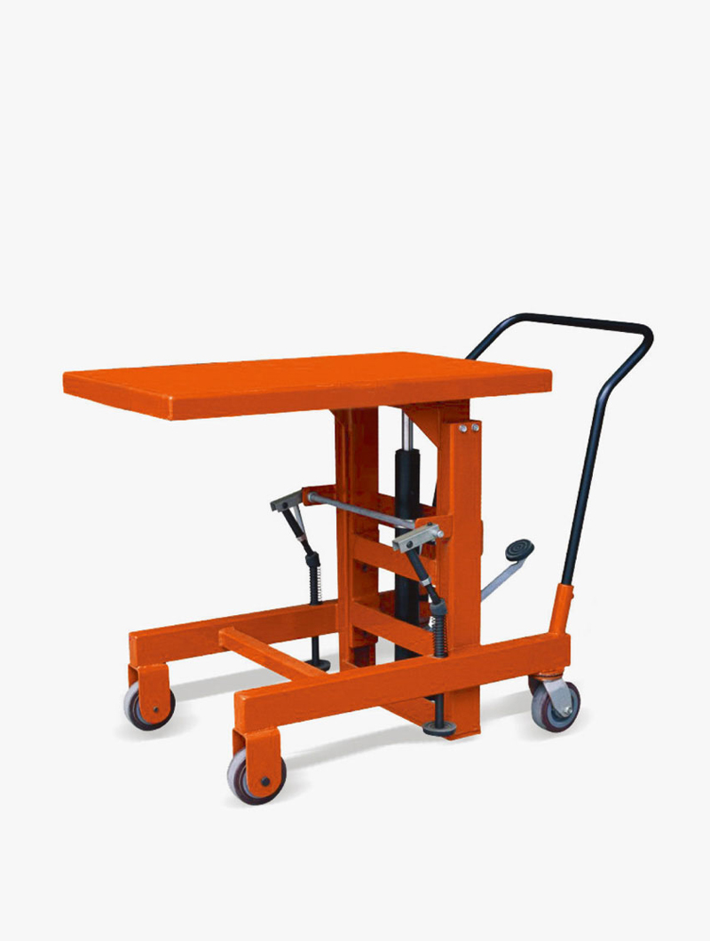 La elevación se realiza mediante un cilindro oleohidráulico con émbolo cromado, anclado dentro del sistema de tijera y accionado por una bomba manual de doble efecto mediante pedal. Este sistema permite al operador elevar la carga de forma progresiva y controlada, minimizando el esfuerzo físico durante el proceso.
