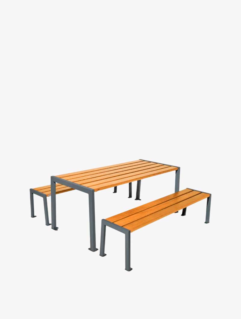 Las mesas de picnic de acero y madera para exterior son ideales para acondicionar espacios públicos.