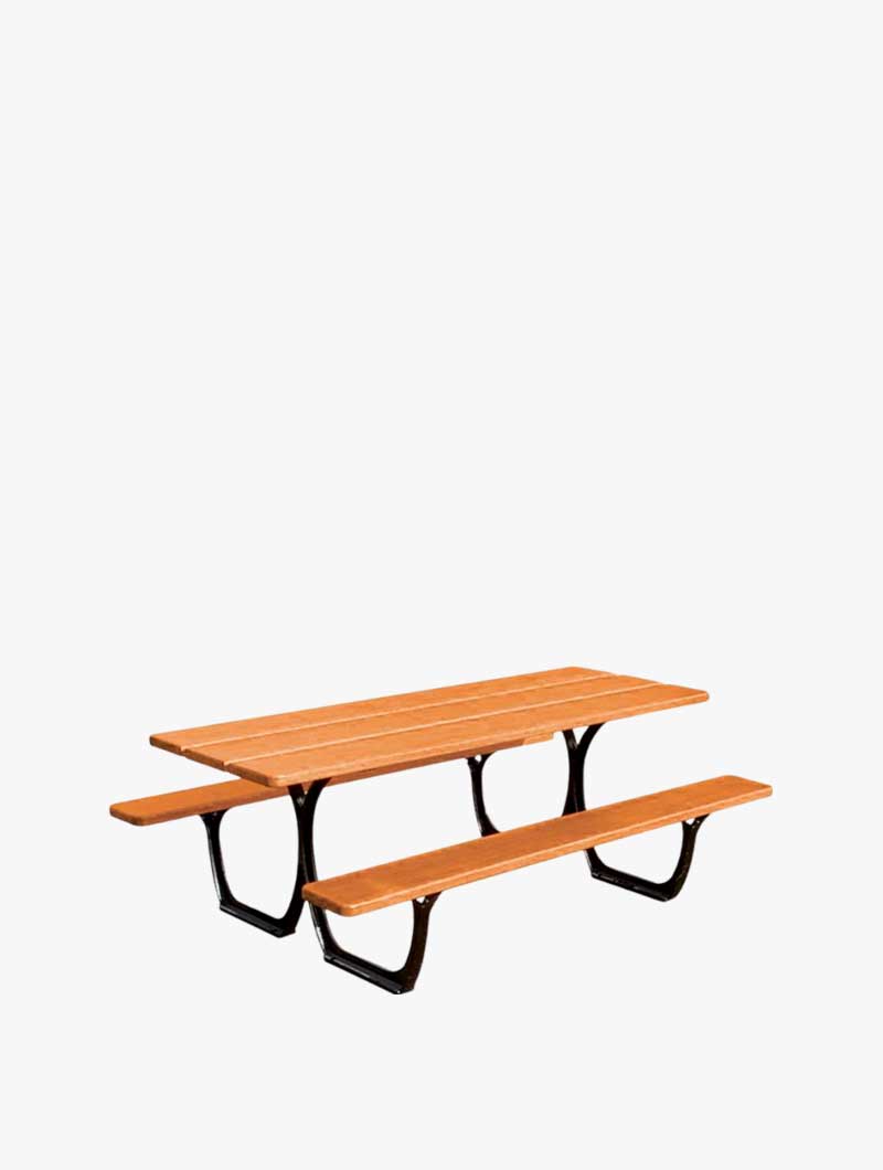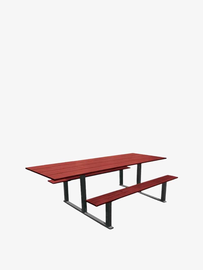 Disponible en versión adaptada para las personas con movilidad reducida. Estructura de tubos de acero pintados sobre zinc según nuestra gama de colores. Asientos y tablero de la mesa de material compacto estratificado de 18 mm de espesor, acabado caoba.