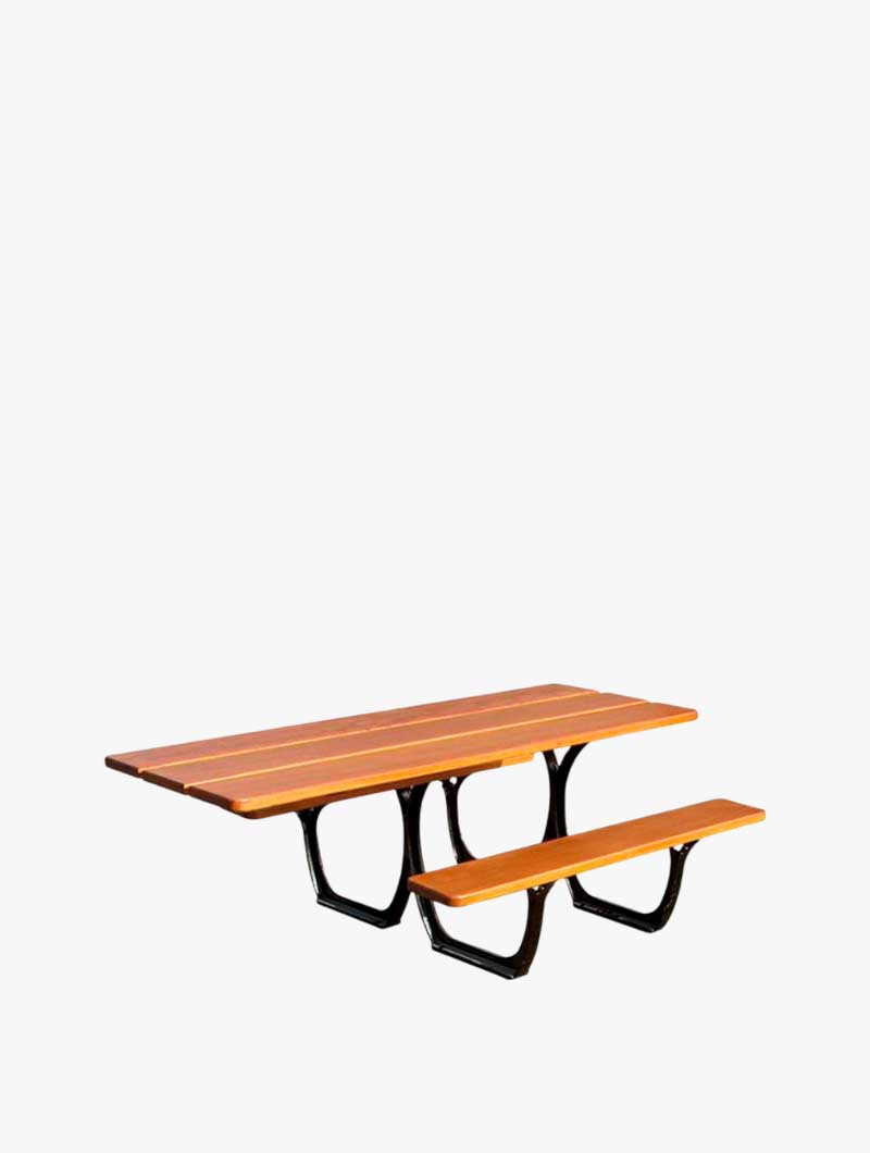 Mesa de grandes dimensiones, disponible en una versión adaptada para las Personas con Movilidad Reducida.Estructura de fundición de acero acabado pintado RAL 9005 sobre zinc.Asientos y tablero de la mesa de láminas de madera exótica de 36 mm de espesor, acabado barnizado color caoba o roble claro.
