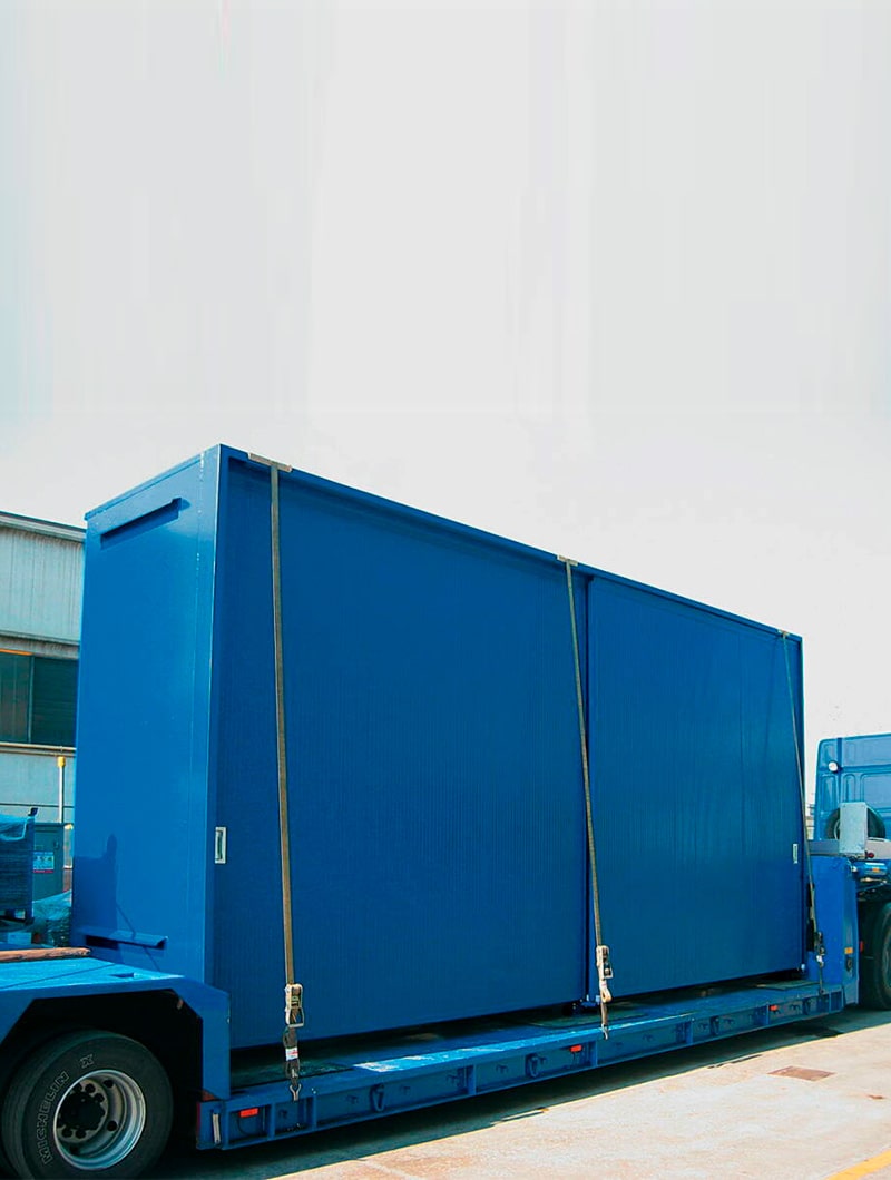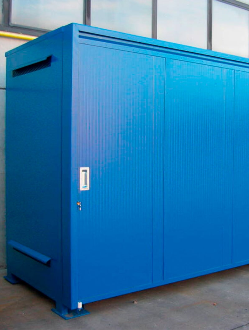 Fabricado en chapa de acero galvanizado y pintado, y opcionalmente con paneles isotérmicos de doble capa de chapa de acero con relleno interior de 50mm de lana mineral.