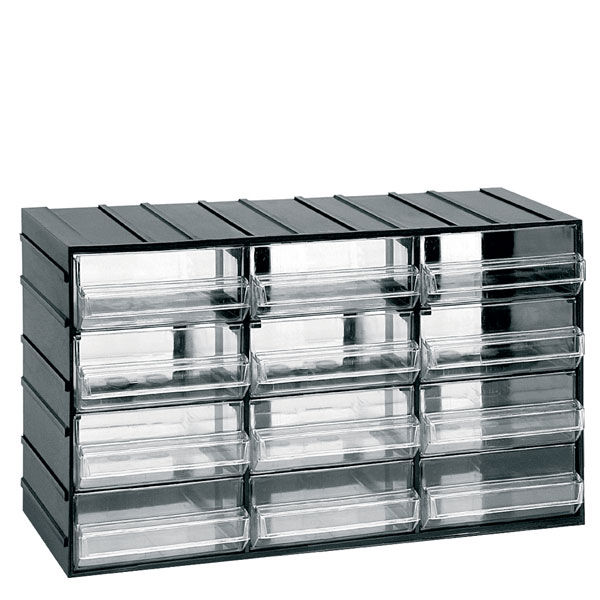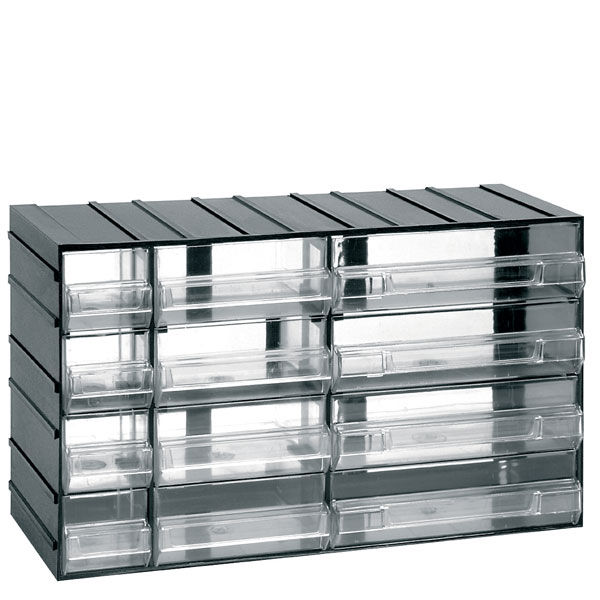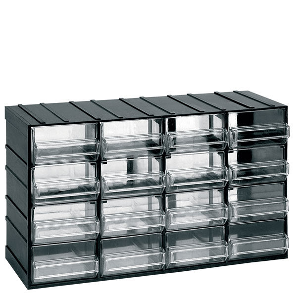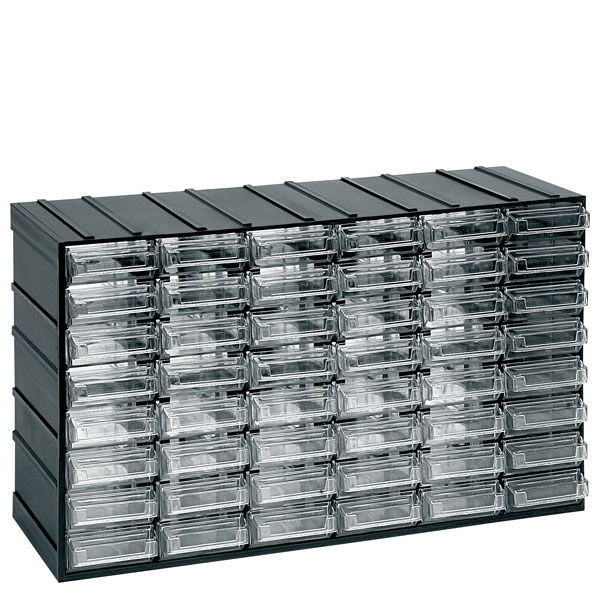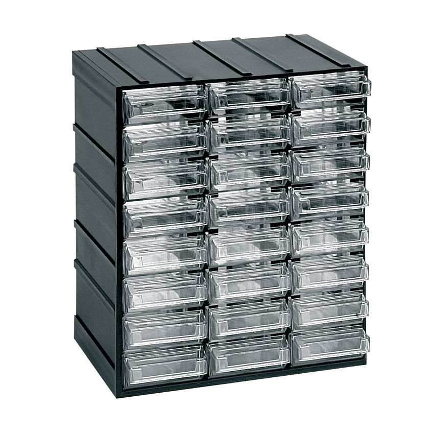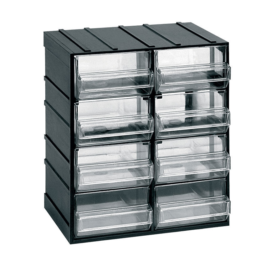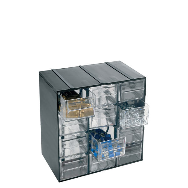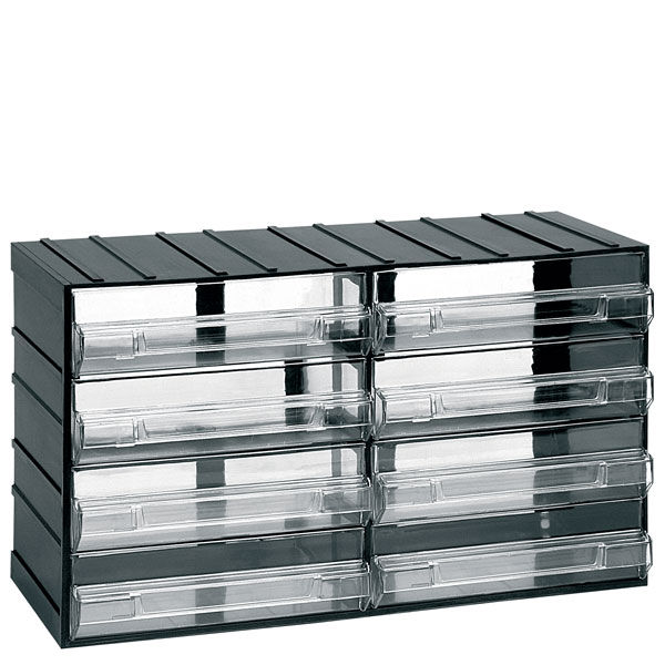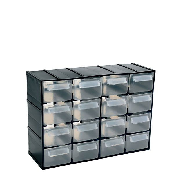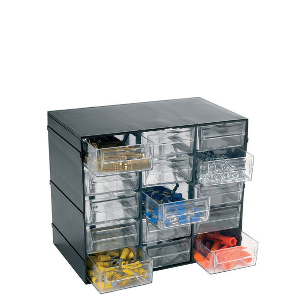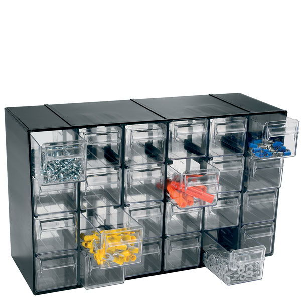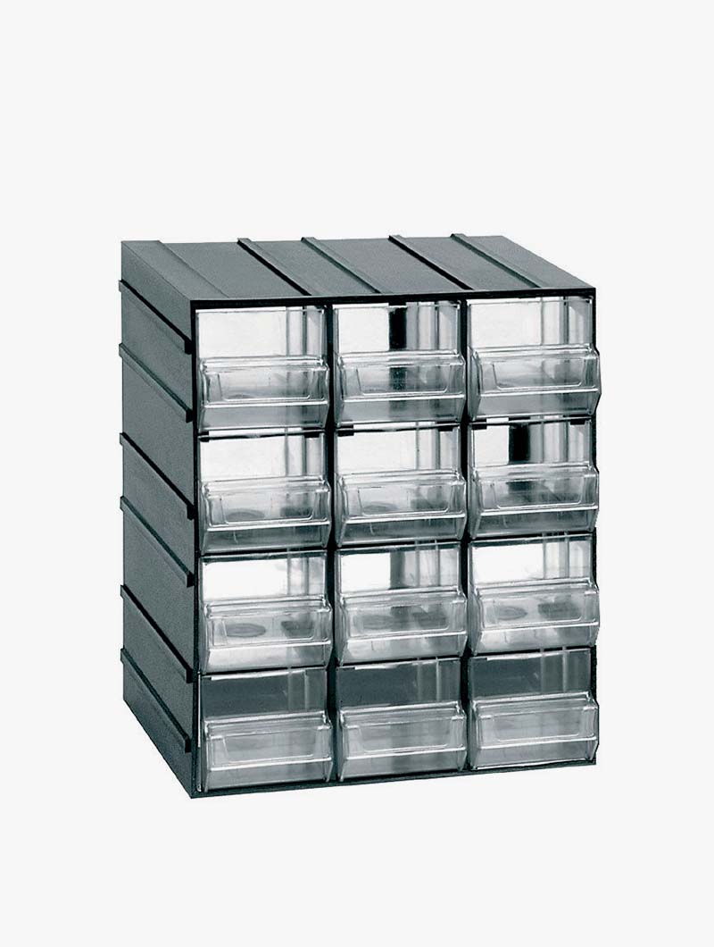 Módulos ensamblables con cajones extraíbles ideales para almacenar y clasificar todo tipo de piezas pequeñas como tornillos, arandelas, tuercas, tapones, remaches, clavos, retenes, arandelas, juntas, etc.