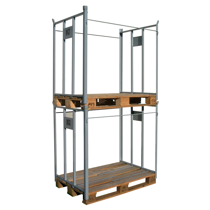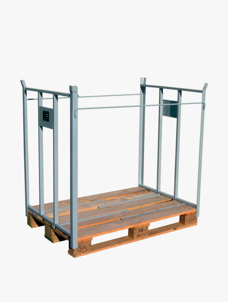 Paredes para apilar pales en altura fabricadas en acero. Todas las materias primas son suministradas por empresas que operan de acuerdo con UNI EN ISO 9001. Se garantiza la capacidad de carga de 1000 kg y superposición declarada con peso distribuido uniformemente. Los contenedores deben elevarse individualmente (no superpuestos). Según las tablas UNI en trabajos estructurales de metal, la clase de tolerancia media igual a ± 3 ‰ de la altura. Según las tablas UNI en materiales ferrosos, tolerancia del 5% del peso nominal. Los contenedores están garantizados sin rebabas, con esquinas redondeadas y bordes para evitar accidentes durante el uso. Pintados con pintura con poliéster en polvo especial para exteriores y secada al horno a 190 °. Se suministra la tara kg. + peso por hectárea, con la aplicación de una etiqueta autoadhesiva de 100 x 35 mm.