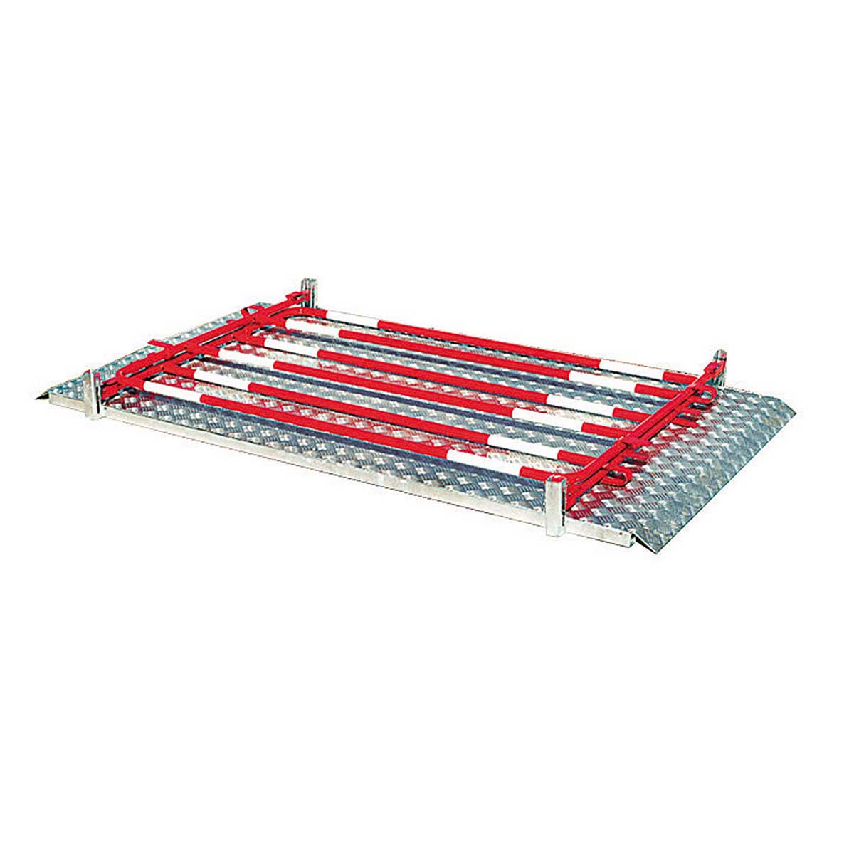 Plataforma en aluminio con superficie antideslizante y pasamanos en acero pintado en rojo con bandas reflectantes.