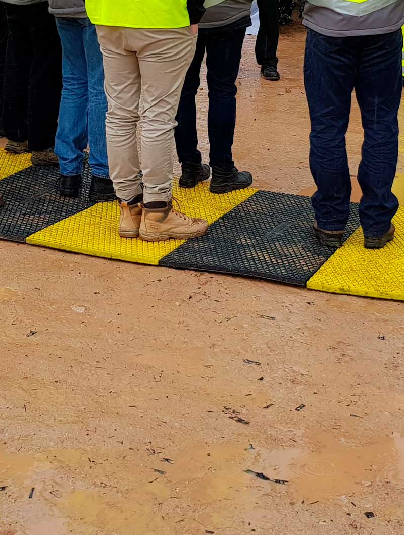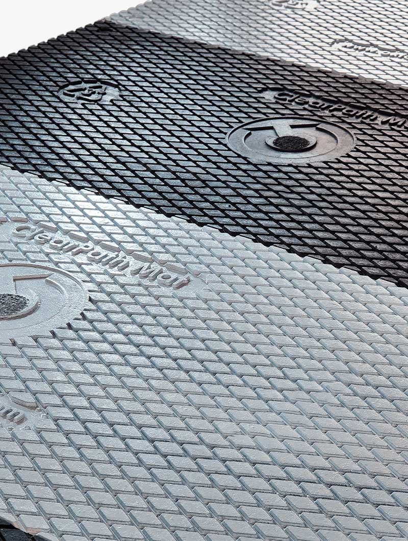 Fabricada en PVC reciclado de alta resistencia, esta alfombra peatonal está especialmente diseñada para ofrecer una superficie estable y antideslizante, incluso sobre terrenos irregulares o de difícil acceso.