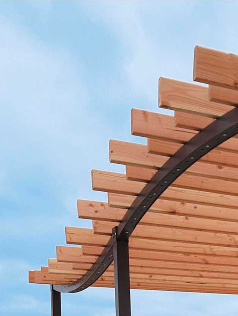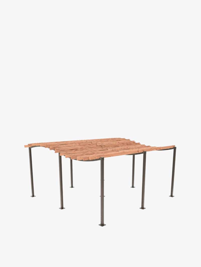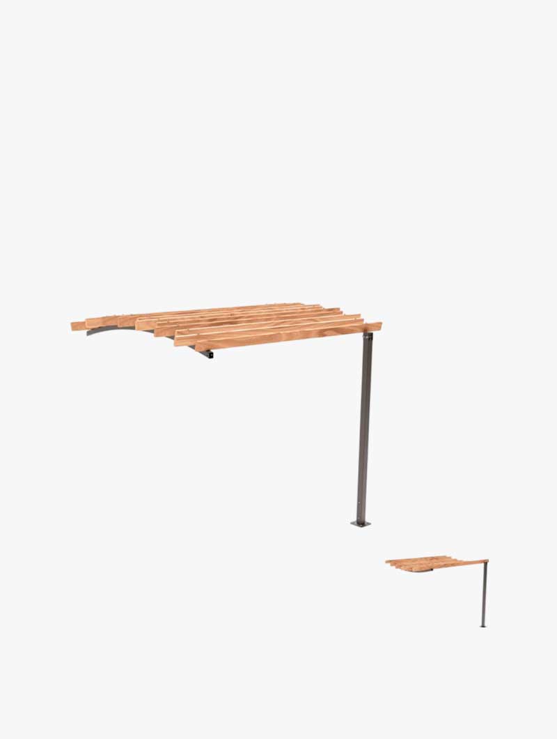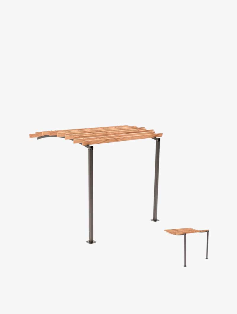 La pérgola con postes están con tubos de acero. El techo está compuesto por 14 láminas de madera resinosa y la estructura de acero está galvanizada y pintada según nuestra gama de colores disponibles. La pérgola se fija sobre placas de acero galvanizado e incluye tacos de expansión para la instalación.