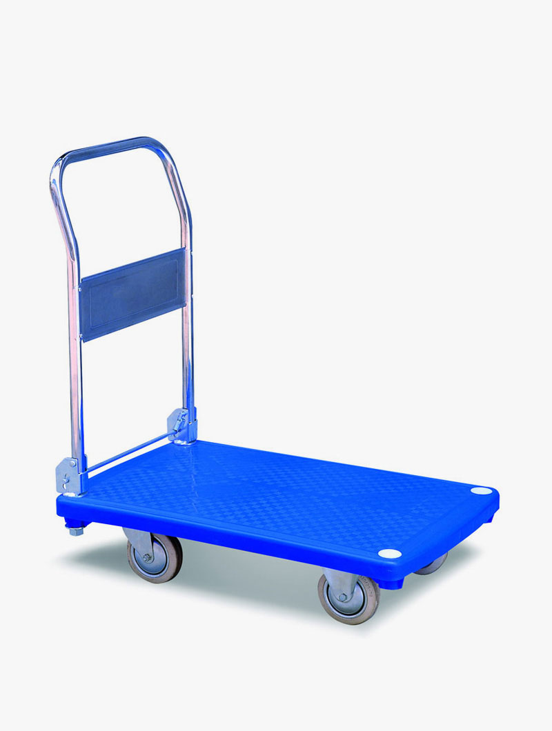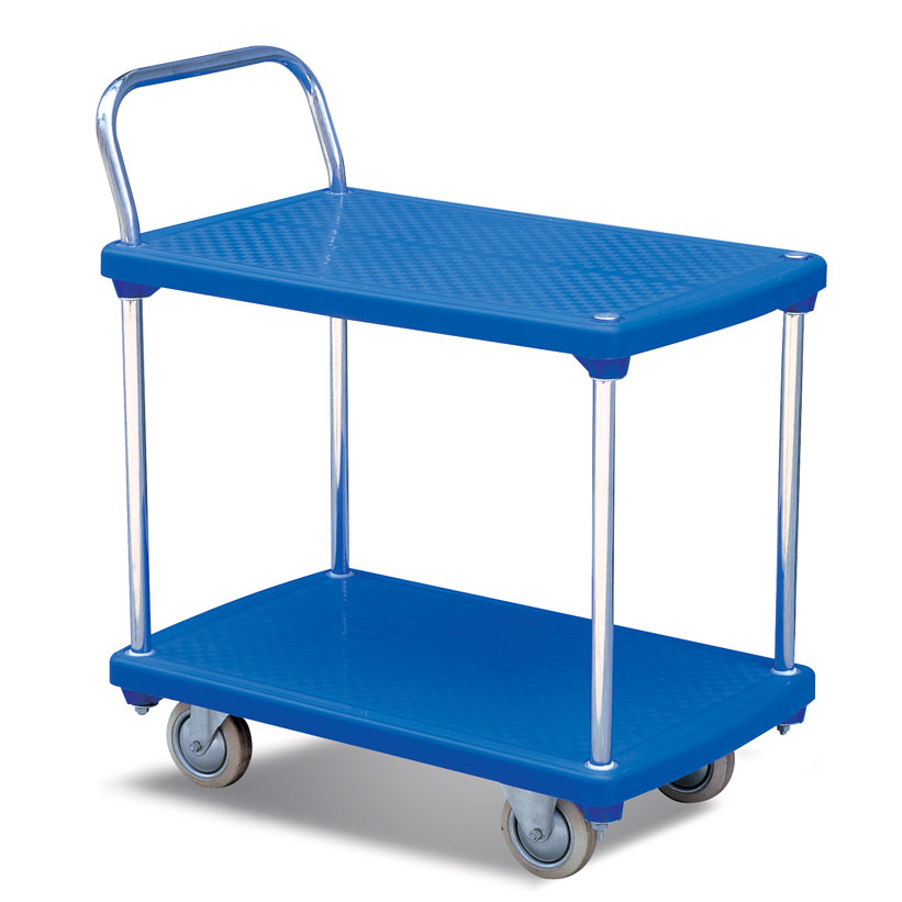 Plataforma de polipropileno, silenciosa e higiénica. Muy ligera. Fácil de maniobrar. Resistente a impactos y con textura rugosa para retener la carga. 2 ruedas fijas y 2 giratorias. Tubos de cromo y soportes para estantes. El timón se pliega para facilitar su almacenaje.