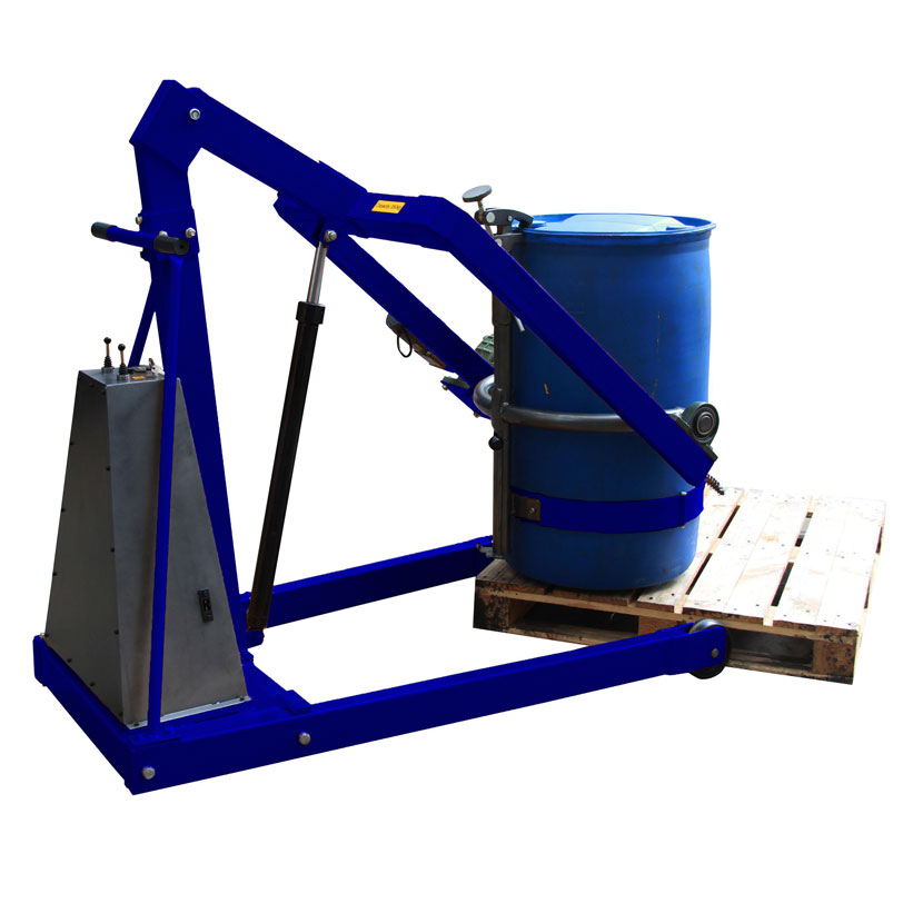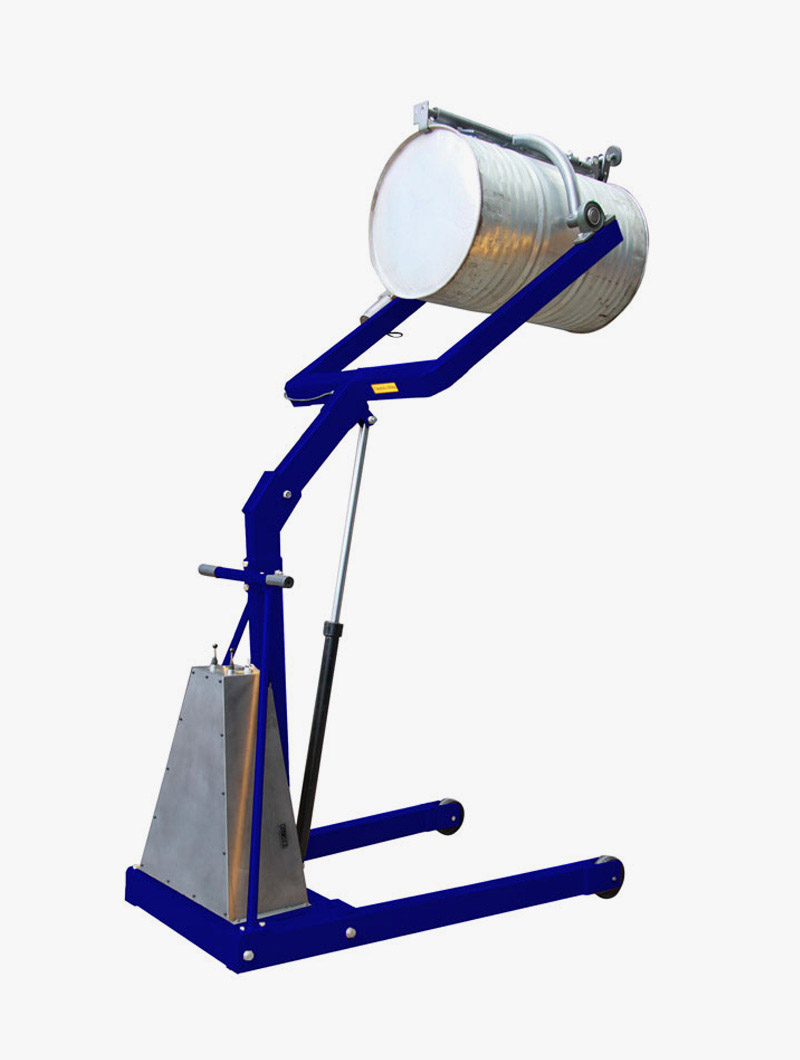 Este potente posicionador permite elevar y voltear bidones de 200 litros (con un peso máximo de 300 Kg) hasta una altura de 1070 mm, facilitando el apilamiento y el vertido.