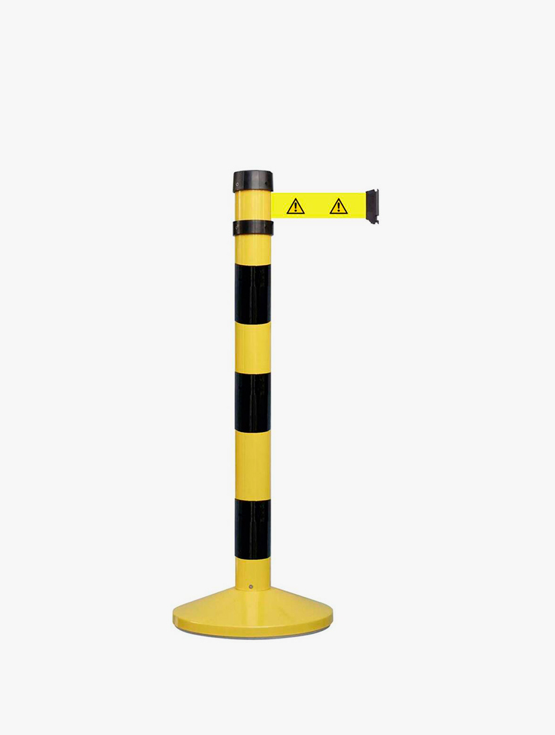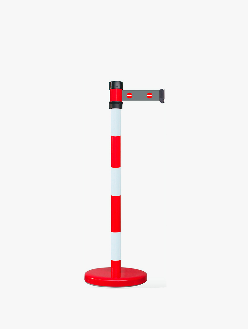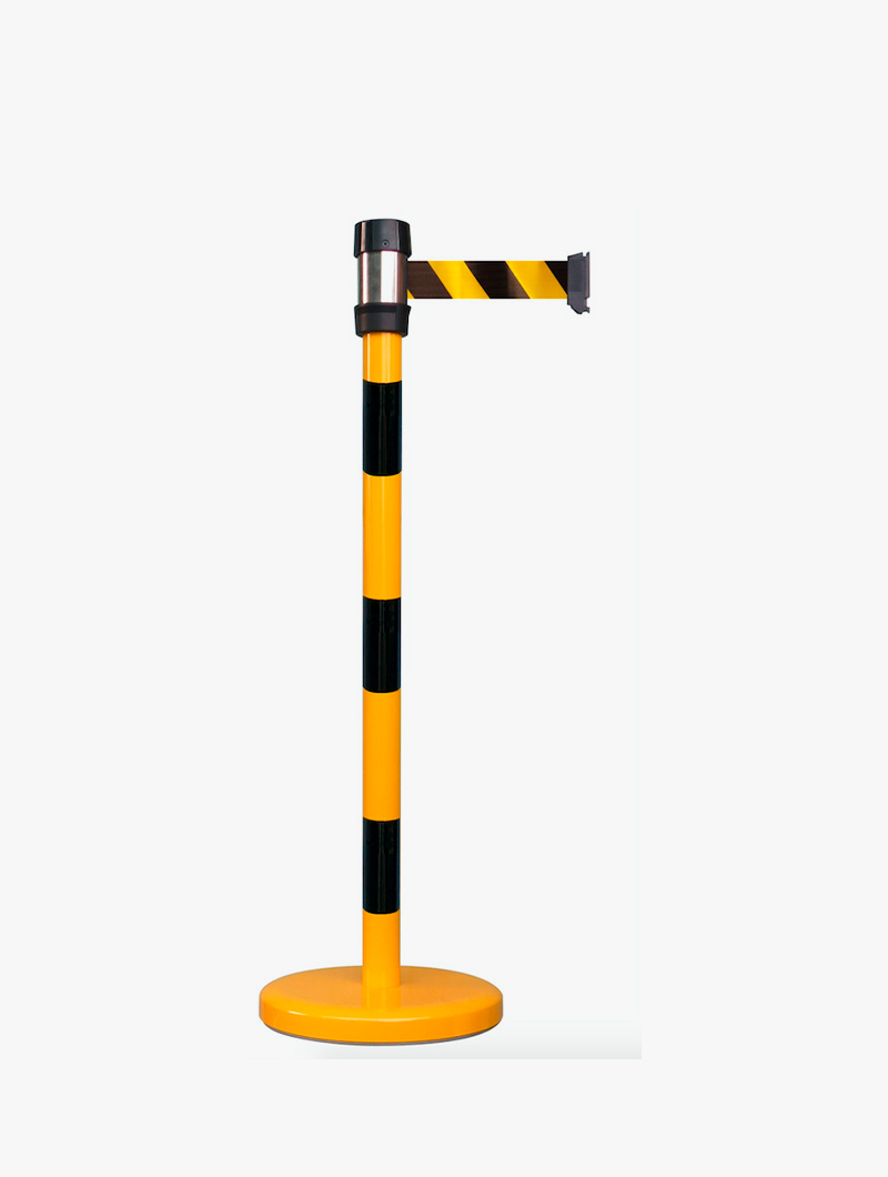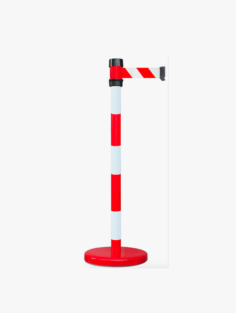Fabricados en acero disponibles en dos colores, con bandas negras o blancas para para mejorar la visibilidad. Con base maciza y cintas disponibles en varios colores. Posibilidad de incorporar mostrador en A4 (opcional).