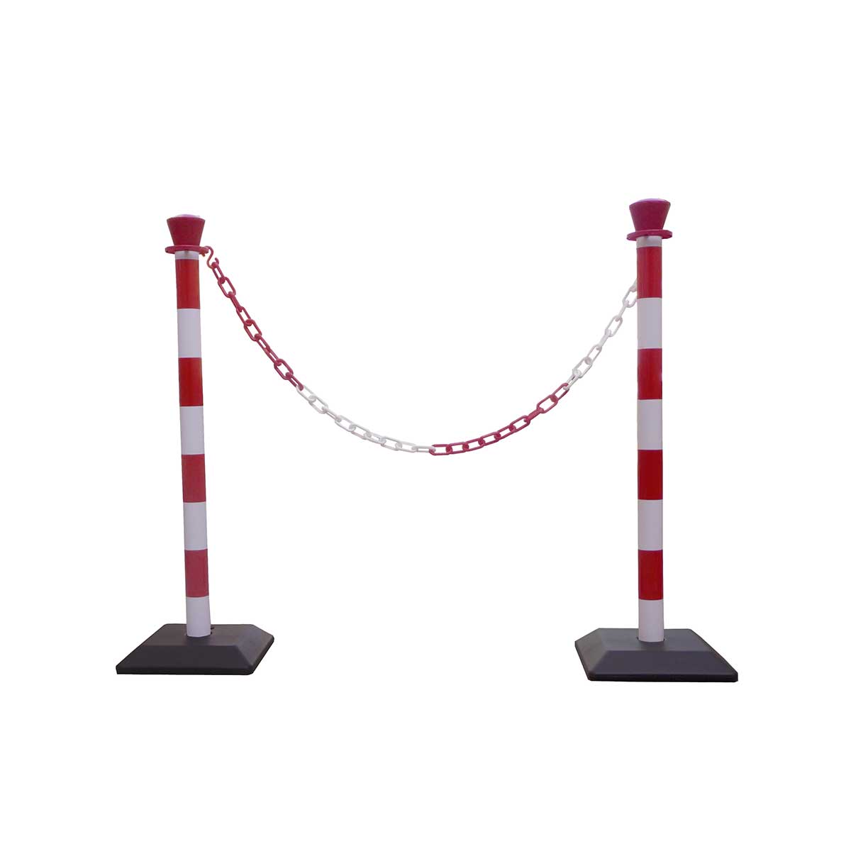 Compuesto de 2 postes de PVC con base de 330x330 mm y 2 travesaños de PVC de 1200 mm con bandas reflectantes blancas y rojas.