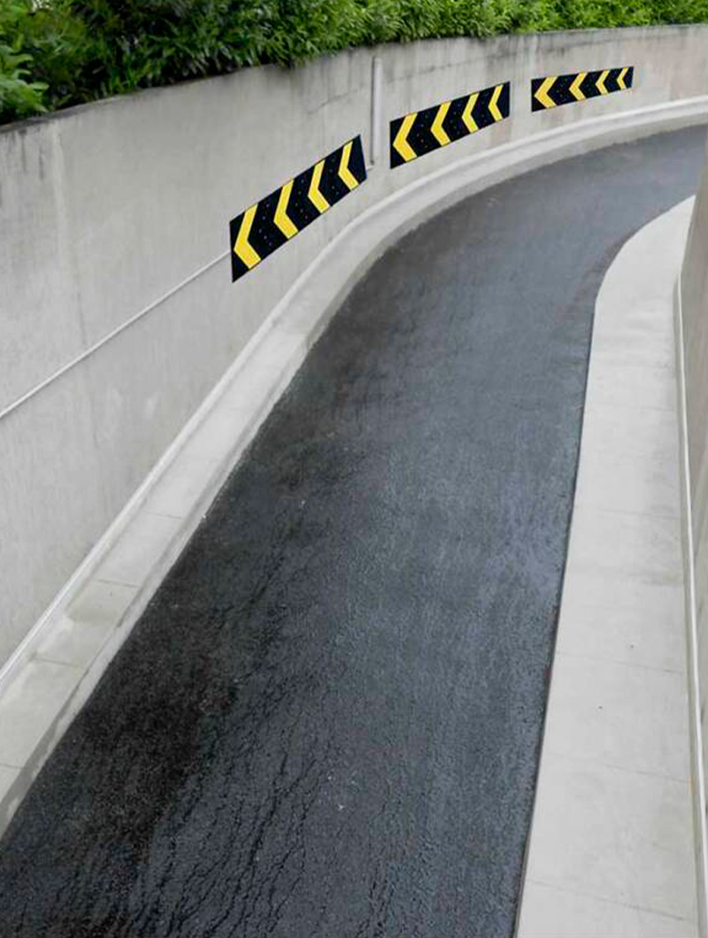 Fabricado en caucho negro con bandas amarillas reflectantes en forma de flecha y 15 ojos de gato, proporcionando una optima visibilidad.