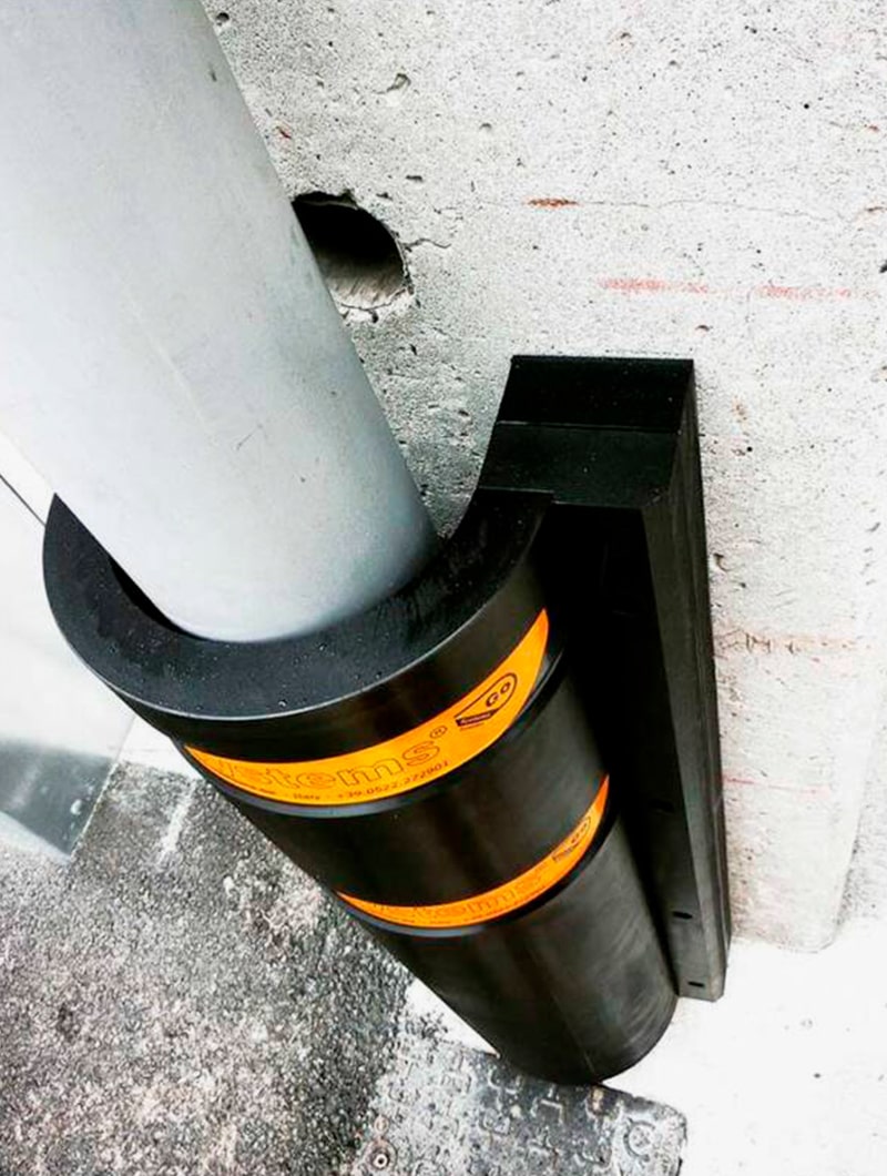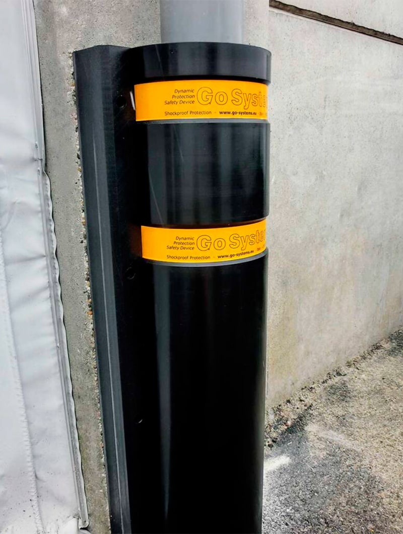 Protector de bajantes fabricado en tecno-polímero deformable con memoria que absorbe el impacto protegiendo tanto la tubería como el vehículo y el material transportado.