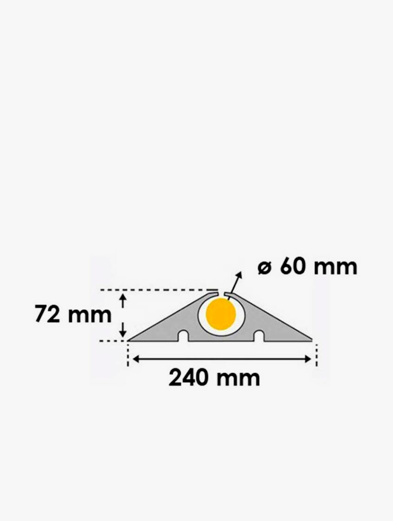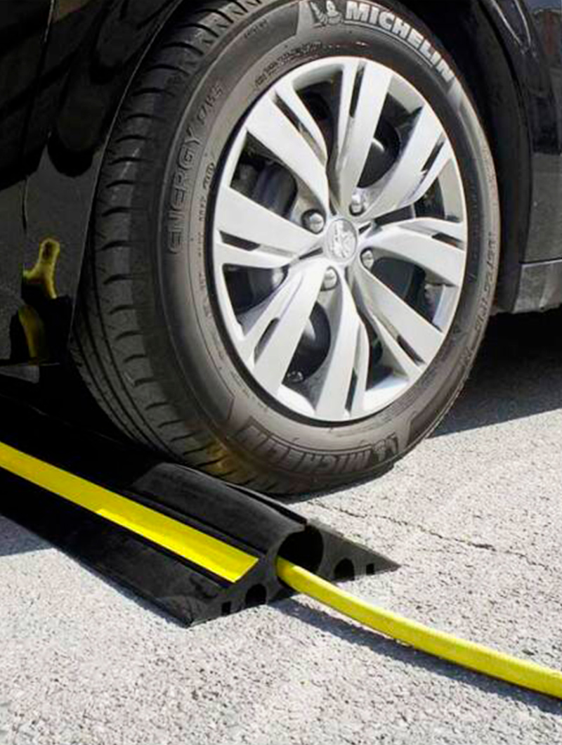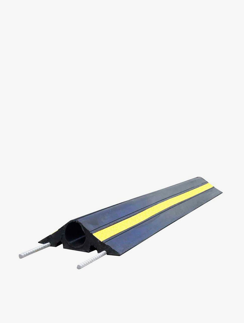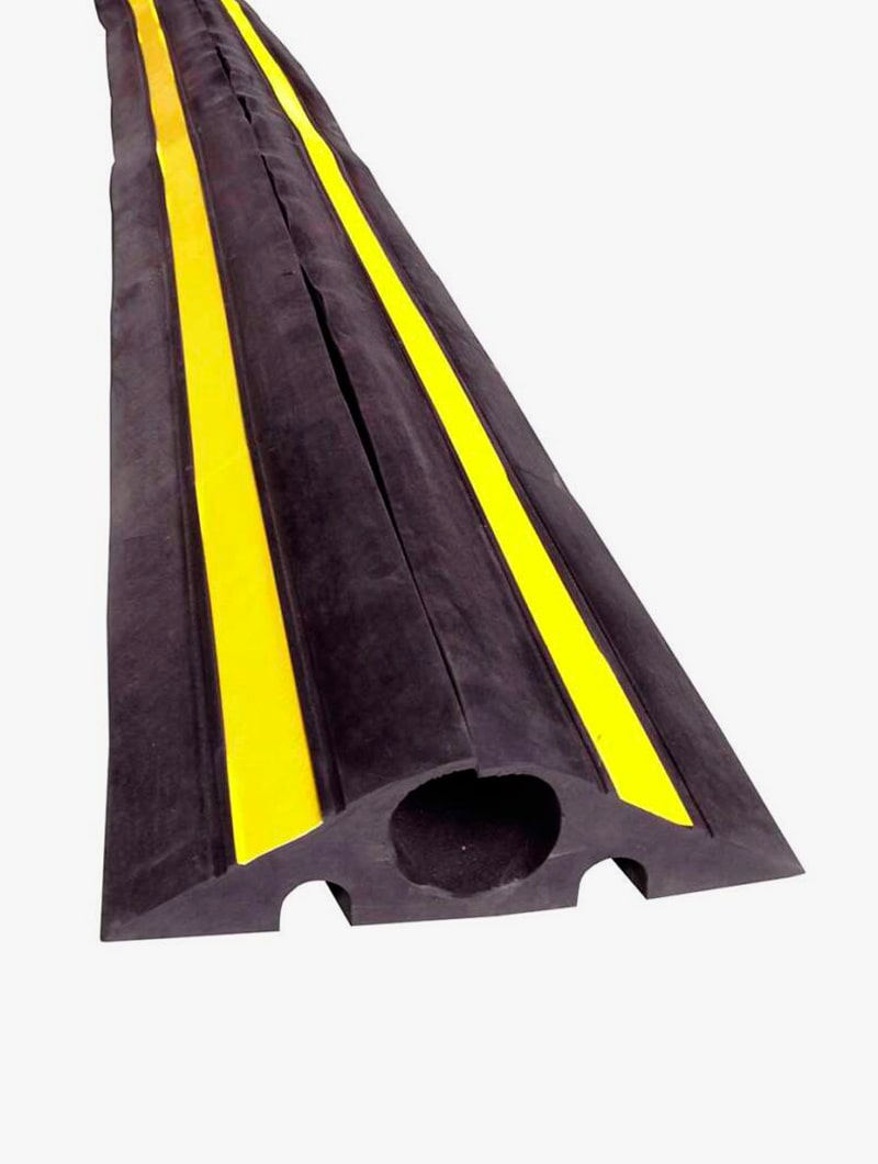 El protector de cable flexible para tráfico pesado es la solución ideal para proteger cables y conducciones en zonas de tránsito intenso. Fabricado en caucho virgen de alta calidad, cada elemento mide 1 metro de longitud y está diseñado para soportar cargas de hasta 40 toneladas, actuando también como ralentizador de velocidad.