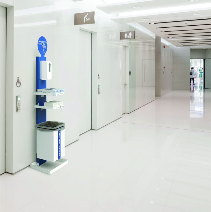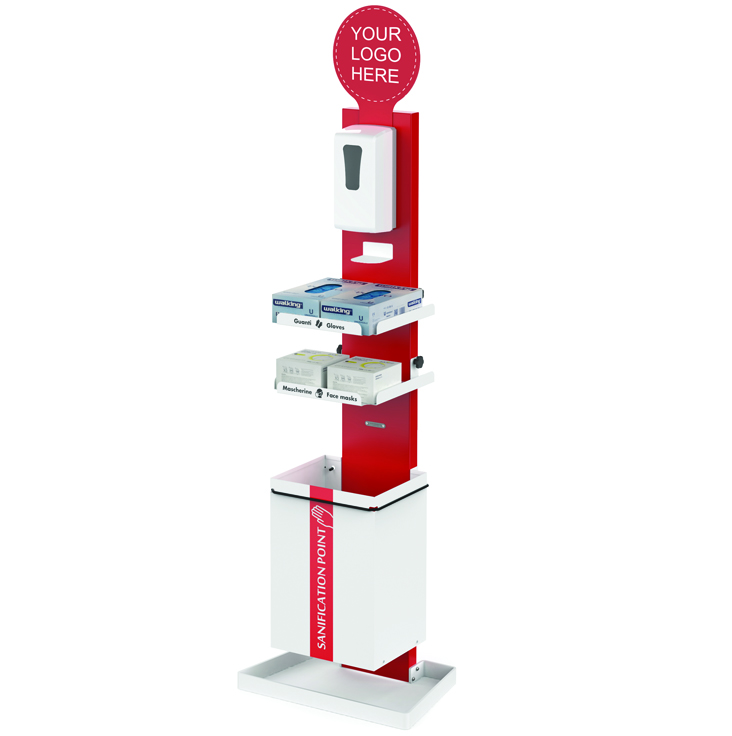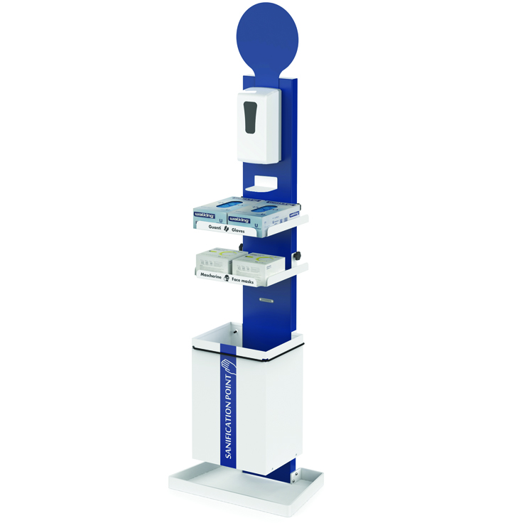 El punto de higiene modelo Magellano es una solución práctica adaptada a los espacios reducidos. Está pensada para ser, al mismo tiempo, un dispensador de gel hidroalcohólico y un punto de distribución de elementos de protección como mascarillas, guantes o toallitas gracias a sus 2 estantes regulables en altura. Fácil e intuitivo de utilizar, tiene la posibilidad de incorporar diferentes pictogramas o o un dispensador automático de gel con sensor infrarrojo*.