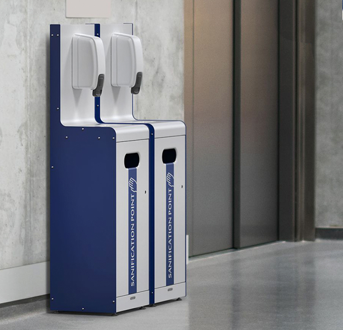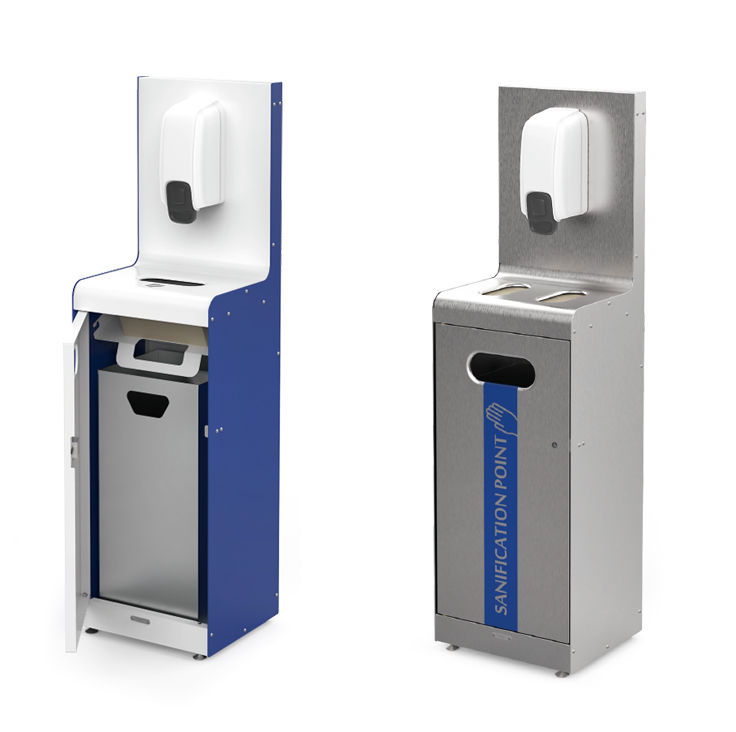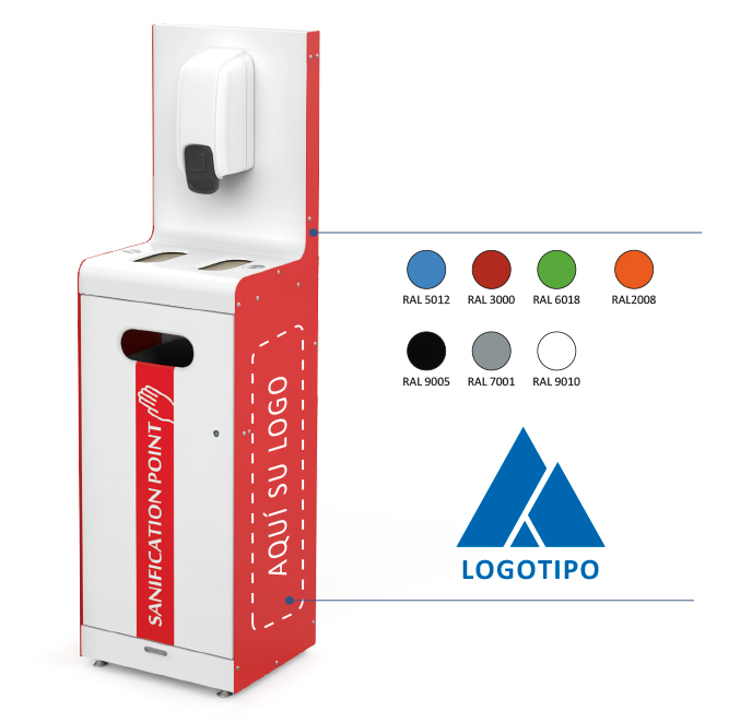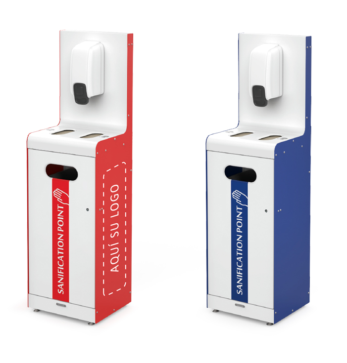 Está pensada para ser, al mismo tiempo, un dispensador de gel hidroalcohólico y dos puntos de distribución de elementos de protección como mascarillas, guantes, toallitas o gorros. Fácil e intuitivo de utilizar con la posibilidad de incorporar diferentes pictogramas.