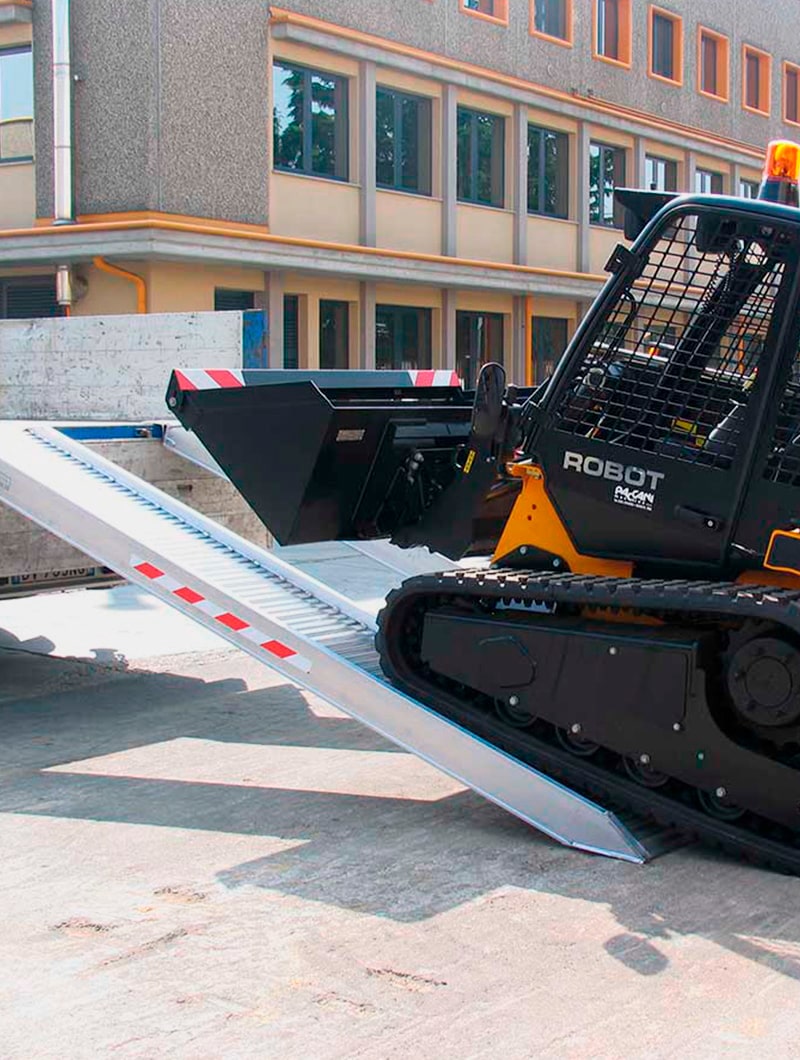 Gracias a su fabricación en materiales de alta resistencia, combinan un bajo peso con una gran capacidad de carga, ofreciendo una solución fiable y segura incluso en los entornos de trabajo más exigentes. Estas rampas permiten el uso de vehículos con anchuras mínimas de neumático de 400 mm, adaptándose a una amplia variedad de maquinaria.