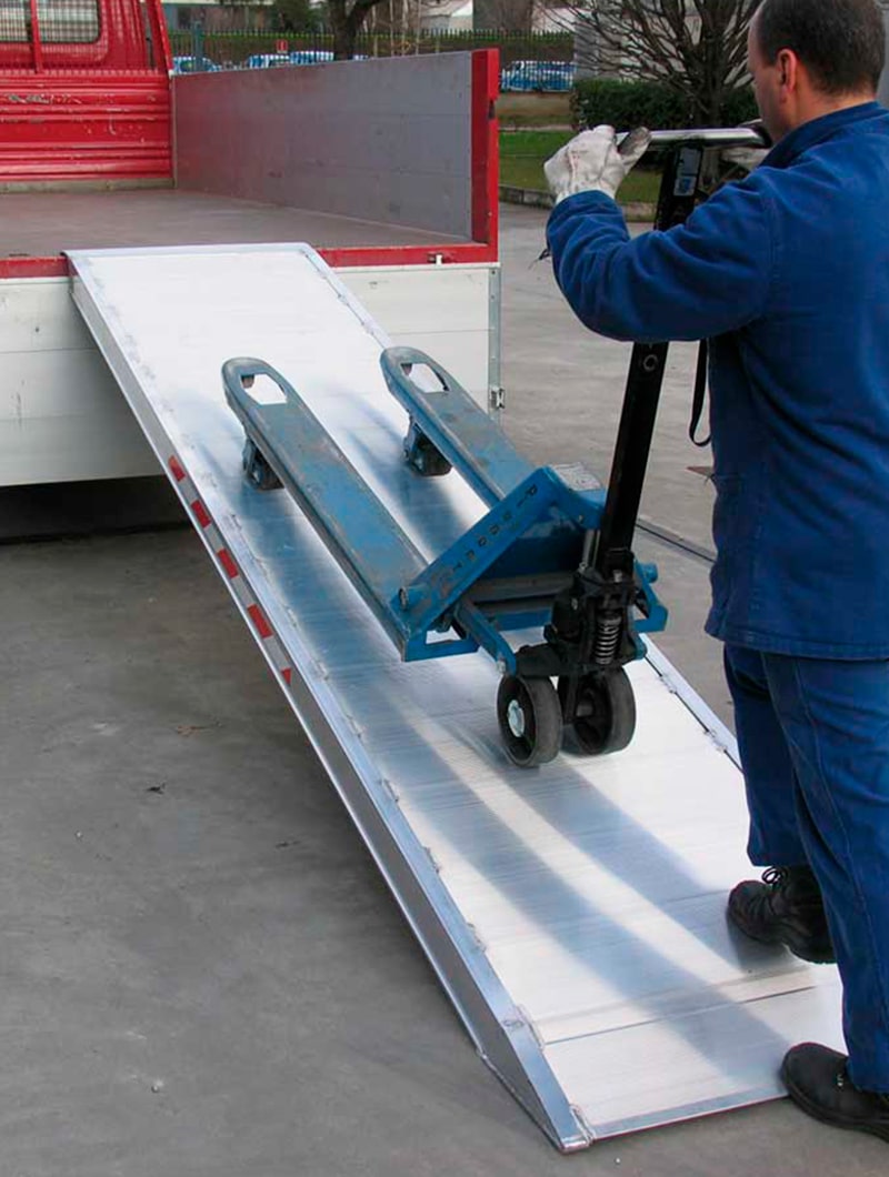 Las rampas para camiones o zonas elevadas están especialmente diseñadas para ser utilizadas en todos aquellos sectores donde se utilizan transpaletas, equipos con pequeñas ruedas de goma o carros manuales durante las operaciones de carga y descarga. Fabricadas en aluminio están disponibles con o sin bordes. Son suministradas con las pestañas necesarias de anclaje estándar. Este sistema de anclaje tiene la ventaja que puede instalarse en cualquier punto a lo ancho de la plataforma de carga y al ser móvil puede ir cambiando su posición según sea necesario. Disponibles en varias longitudes y anchos.