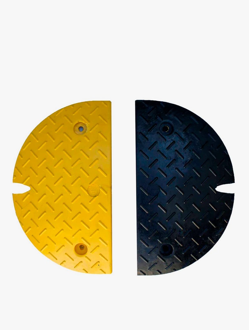 Reductor de velocidad modular de caucho virgen vulcanizado y resistente a los rayos UV. Se suministra en kits de 2 elementos de 50 cm de largo, 1 negro y 1 amarillo. Con una altura de 60 mm, reducirá la velocidad del tráfico a 25 km / h. Cada elemento está equipado con 4 reflectores y un pasa cables de ø 27 mm. Extremos en forma de media luna, vendidos como opción, también incluyen una entrada de cable. Conectores en forma de H también se venden por separado para unir los elementos y maximizar la resistencia y la durabilidad. Las fijaciones para cemento o asfalto se deben pedir por separado. Evite el contacto prolongado con hidrocarburos.