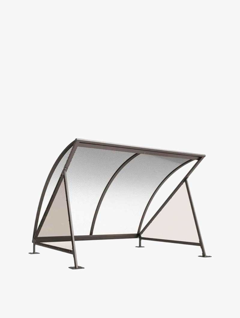 Refugio para bicicletas con capacidad de aparcamiento para 6 bicicletas por módulo. Estructura de postes de tubos de acero fijados mediante tornillos sobre inserciones. Techo de travesaños de tubo de acero fijados mediante tornillos sobre inserciones, canalón de perfil de aluminio, bóveda alveolar de 6mm de espesor con tratamiento anti-UV. Cerramientos laterales de policarbonato ahumado de 4 mm de espesor. Posibilidad de añadir aparcabicicletas de 6 plazas de tubo de acero de ø 22mm, fijado sobre los travesaños mediante tornillos de acero INOX suministrados.