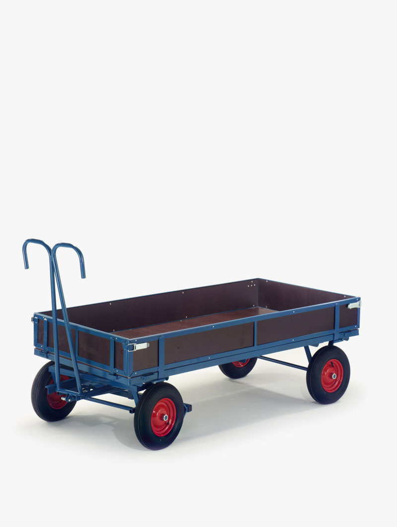 Remolques para 700kg y 1000kg con estructura completamente soldada con capacidad de carga de 700kg o 1000kg según el modelo. Modelos sin paredes, con paredes de 220mm de altura abatibles 180º, o con paredes rejadas de 750mm de altura. Dispone de freno de estacionamiento que actúa sobre las ruedas delanteras. Timón de arrastre, opcionalmente con enganche para remolcar varios remolques a la vez. Se entregan montados.