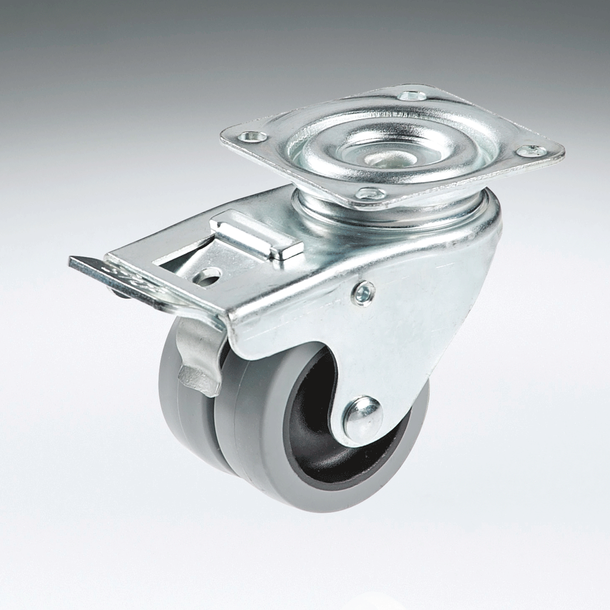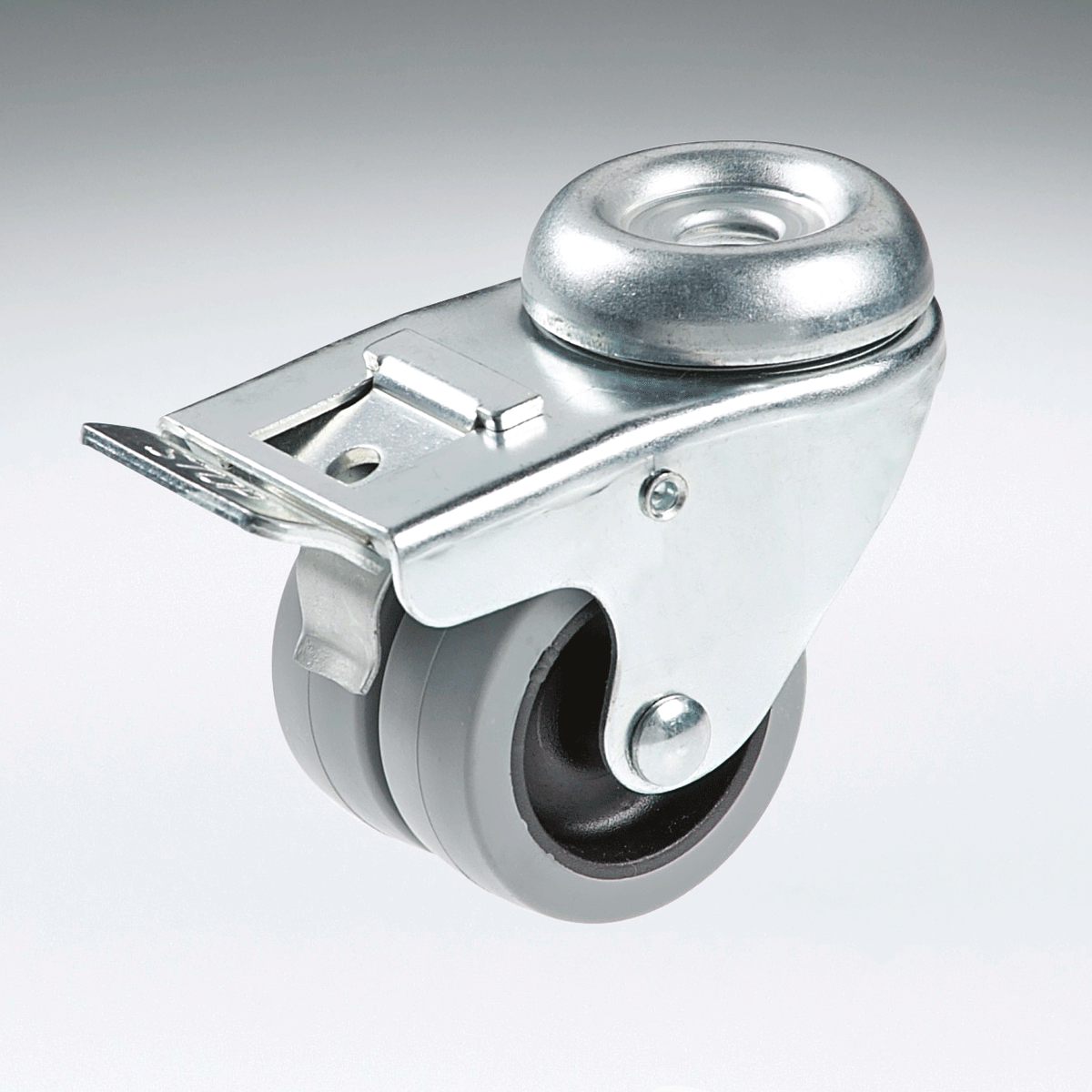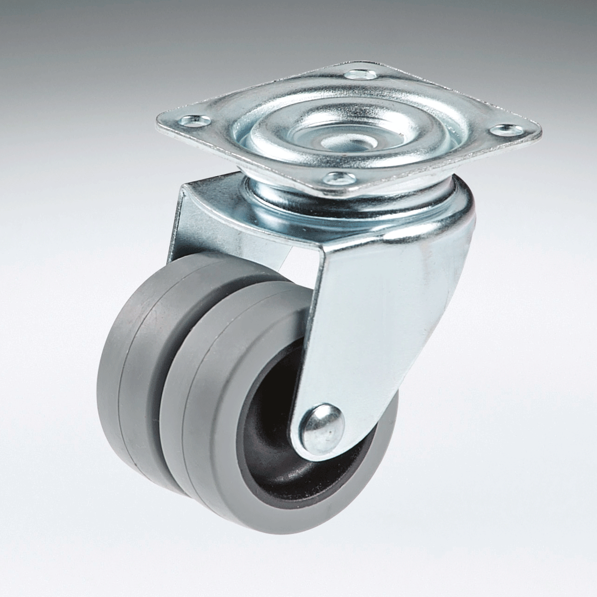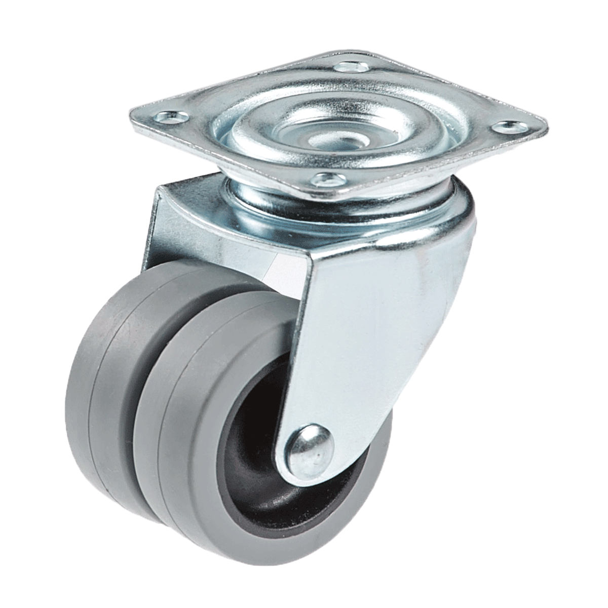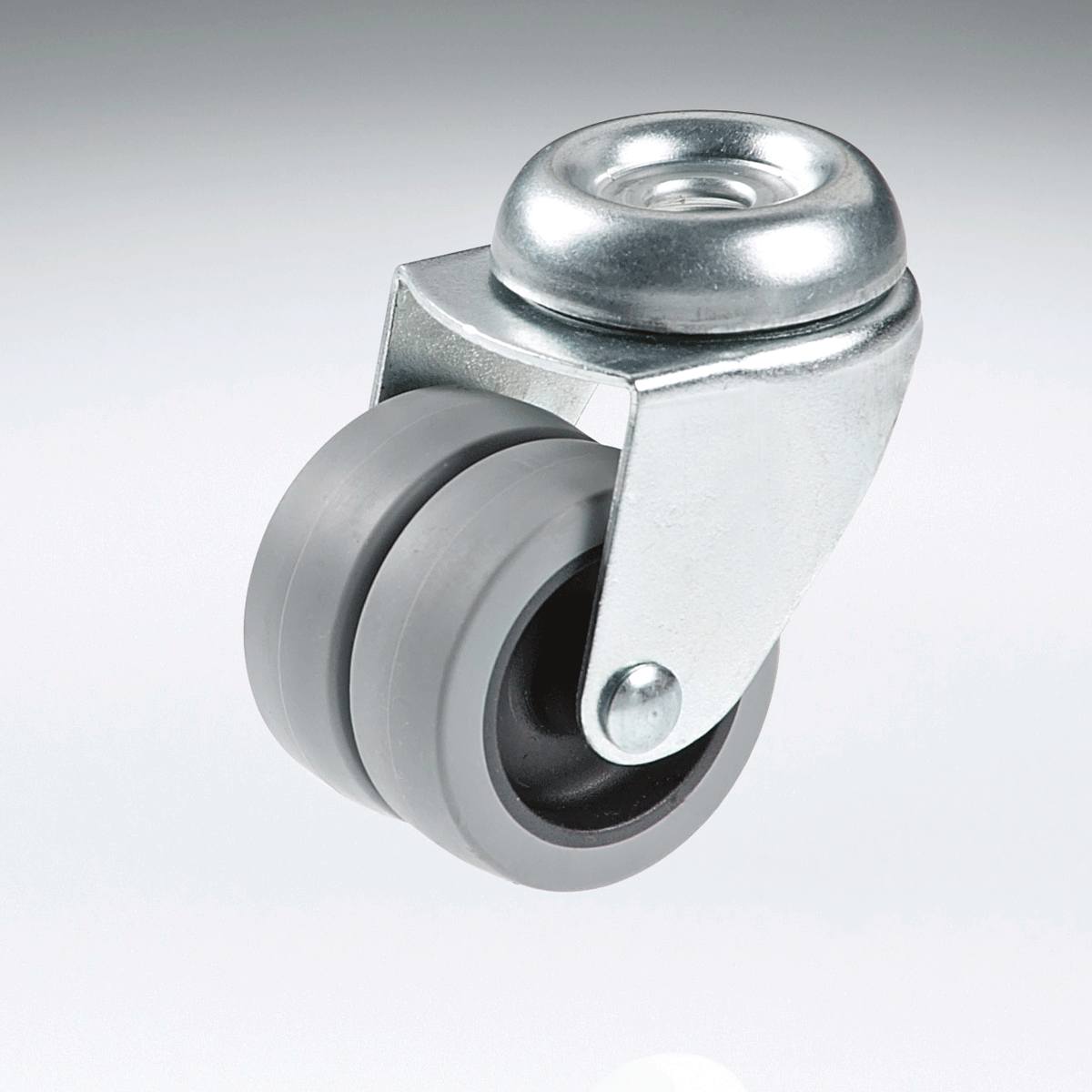 Rueda de goma gris con núcleo de polímero termoplástico de color negro, disponible con cojinete de rodamiento liso o de bolas.