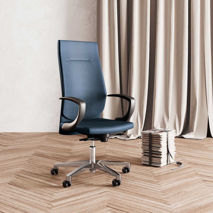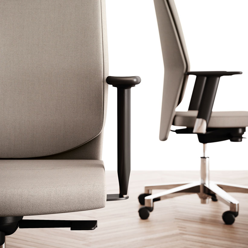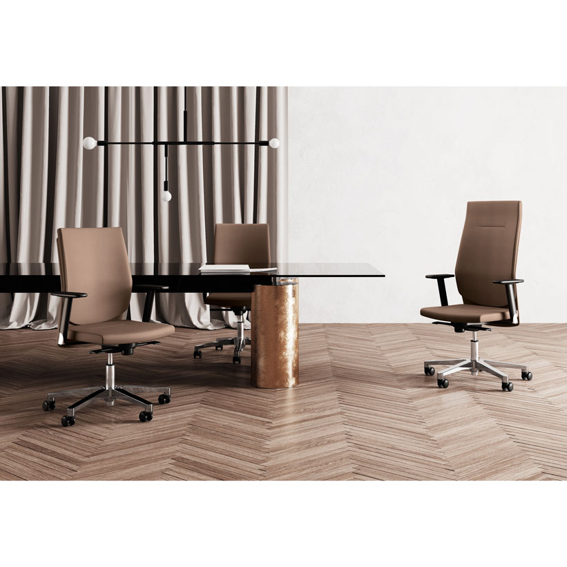 Colección ejecutiva con un toque moderno, cuidadosamente diseñada, que destaca por la forma de su respaldo que realza sus proporciones. La forma de cada elemento permite un acabado perfecto con cuero o tela.
