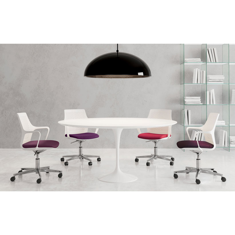 La suavidad de este modelo de bastidor simple se adapta perfectamente a los cuatro tipos de base, lo que hace que esta silla sea adecuada para una serie de aplicaciones. El cojín añade color y un toque de estilo a la silla y al entorno que la rodea, gracias a las múltiples combinaciones posibles.