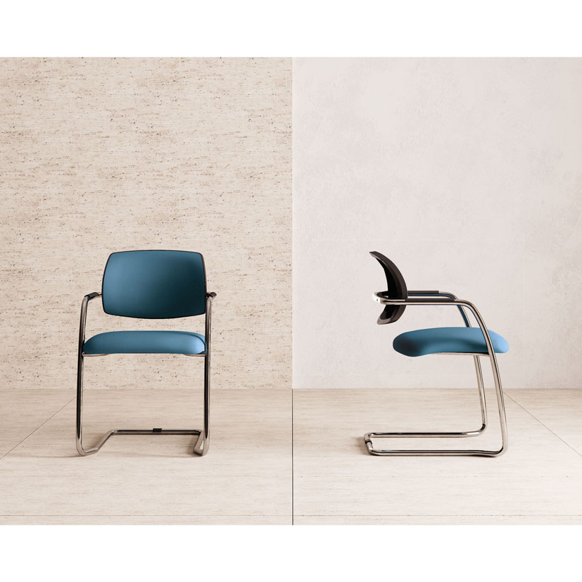 Gracias a su especial estructura arqueada en tubo de acero cromado y a la forma de su respaldo acolchado, esta silla de invitados con su estructura de base tiene un aspecto dinámico y cautivador.