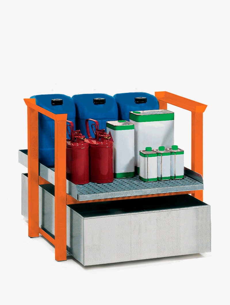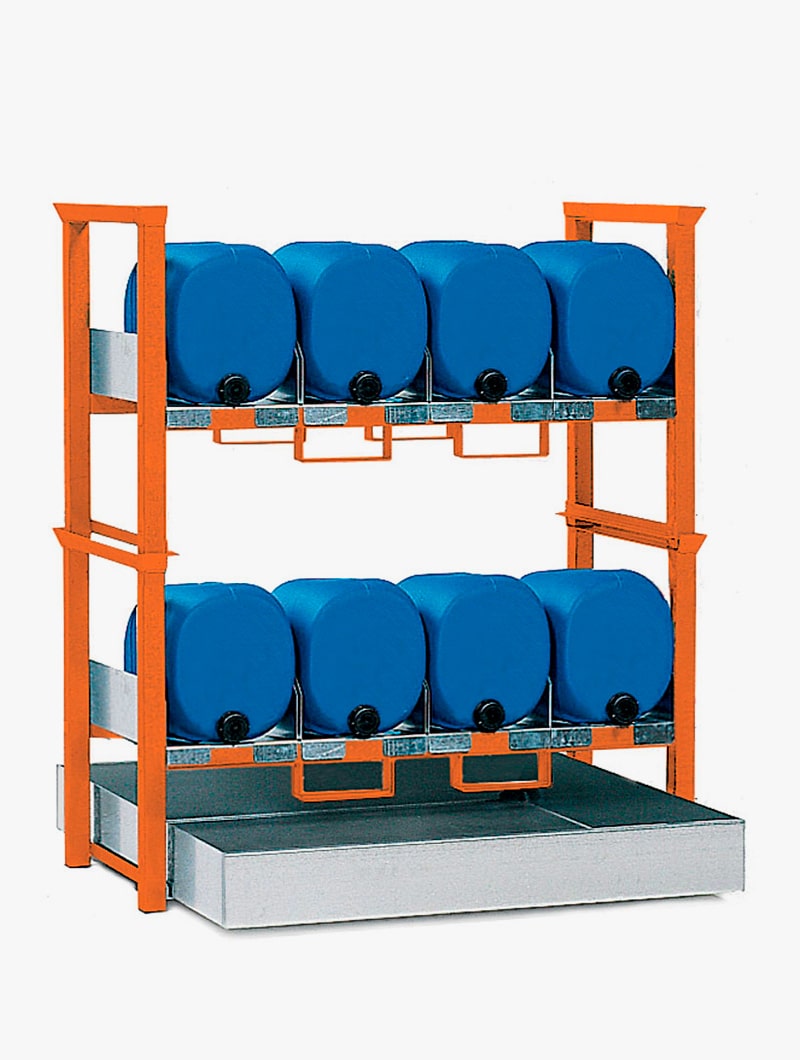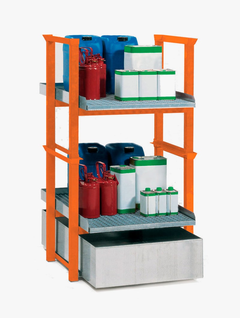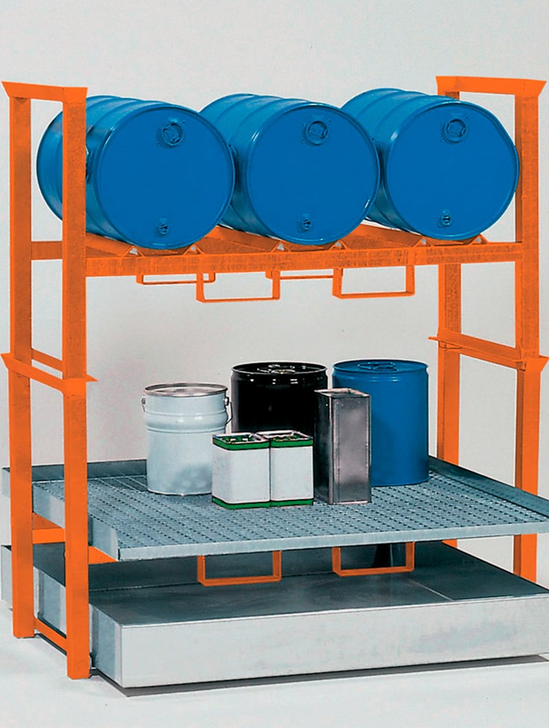 Soportes apilables con cubeto para el almacenamiento de bidones y pequeños recipientes