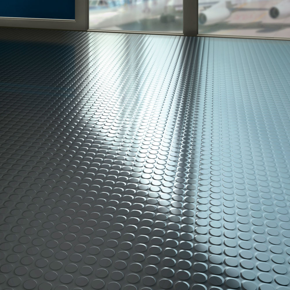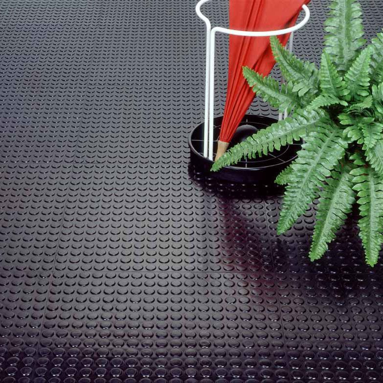 Suelo de goma de color sólido con superficie anti-deslizante con formas redondas y reverso preparado para unión con adhesivo.