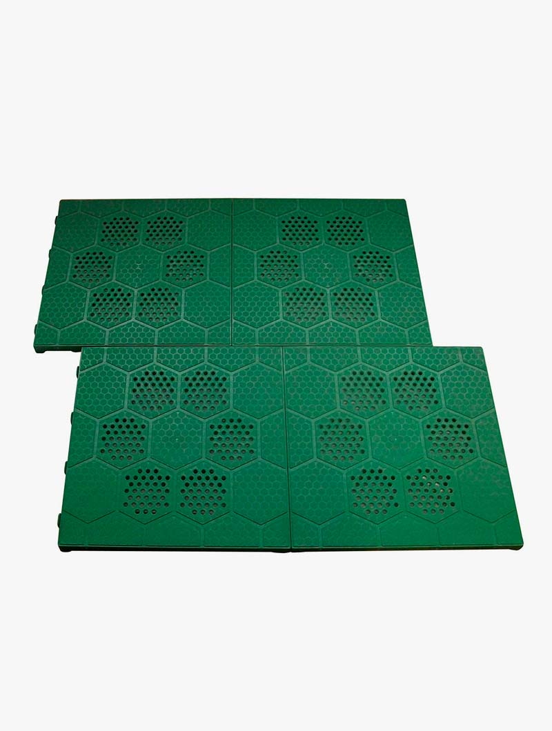 Disponible en colores verde y teja, el Suelo HEXA se suministra en palets de 240 piezas que cubren aproximadamente 40 m², con rampas y ángulos opcionales para mejorar la accesibilidad y la seguridad en los bordes. Con una garantía de 10 años, ofrece una larga vida útil incluso en entornos exigentes como garajes, talleres, fábricas, hangares o zonas de obra.