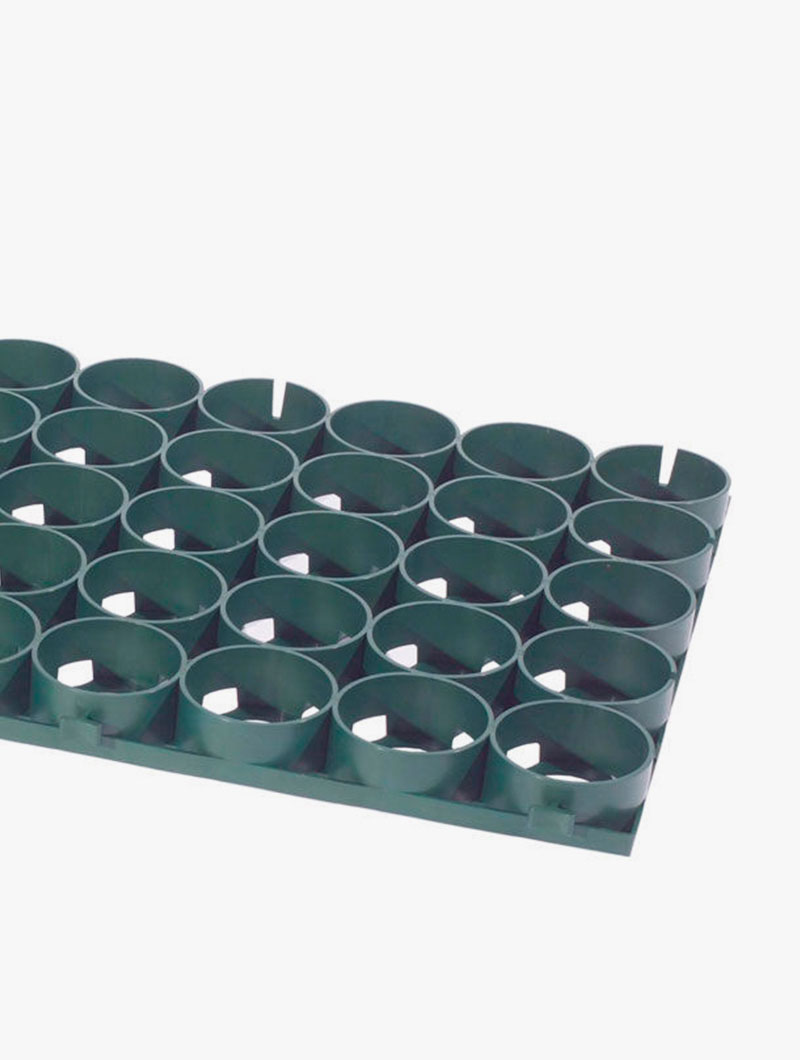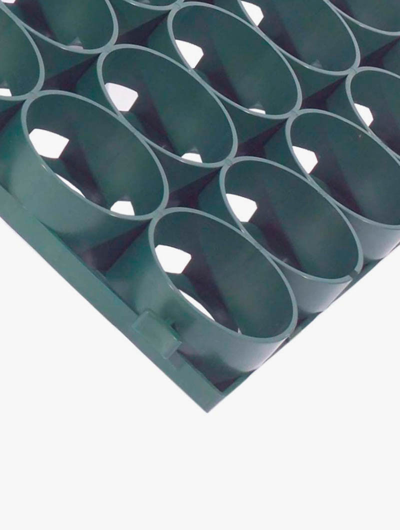 Su diseño robusto distribuye la carga de forma uniforme y mantiene el césped protegido bajo el nivel superior de la rejilla, evitando el aplastamiento y las fricciones que deterioran las raíces. Al mismo tiempo, permite el paso del agua, el aire y los nutrientes, favoreciendo el crecimiento natural del terreno.