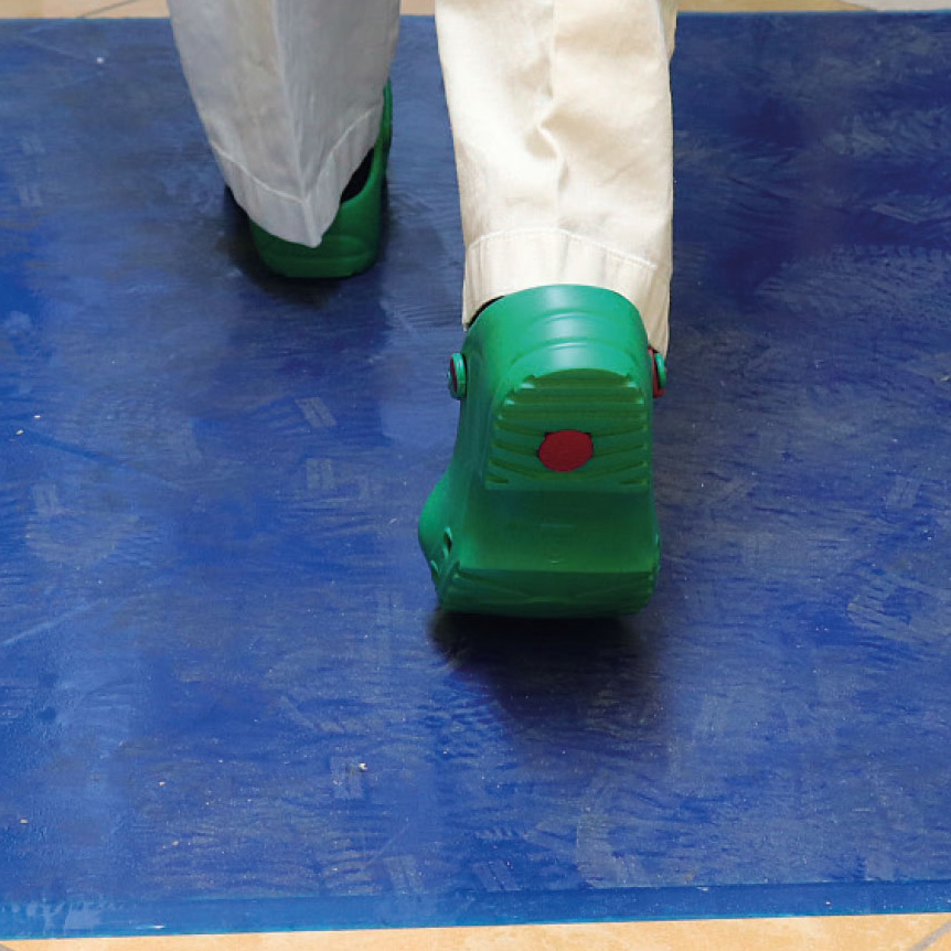 Fabricada con láminas de polietileno superpuestas y numeradas, incorpora una capa adhesiva tratada con un agente biocida que actúa directamente sobre las suelas del calzado, eliminando partículas contaminantes y bloqueando la proliferación de bacterias y hongos.
